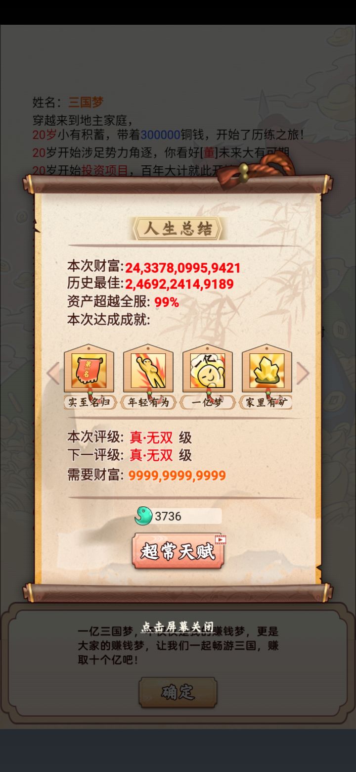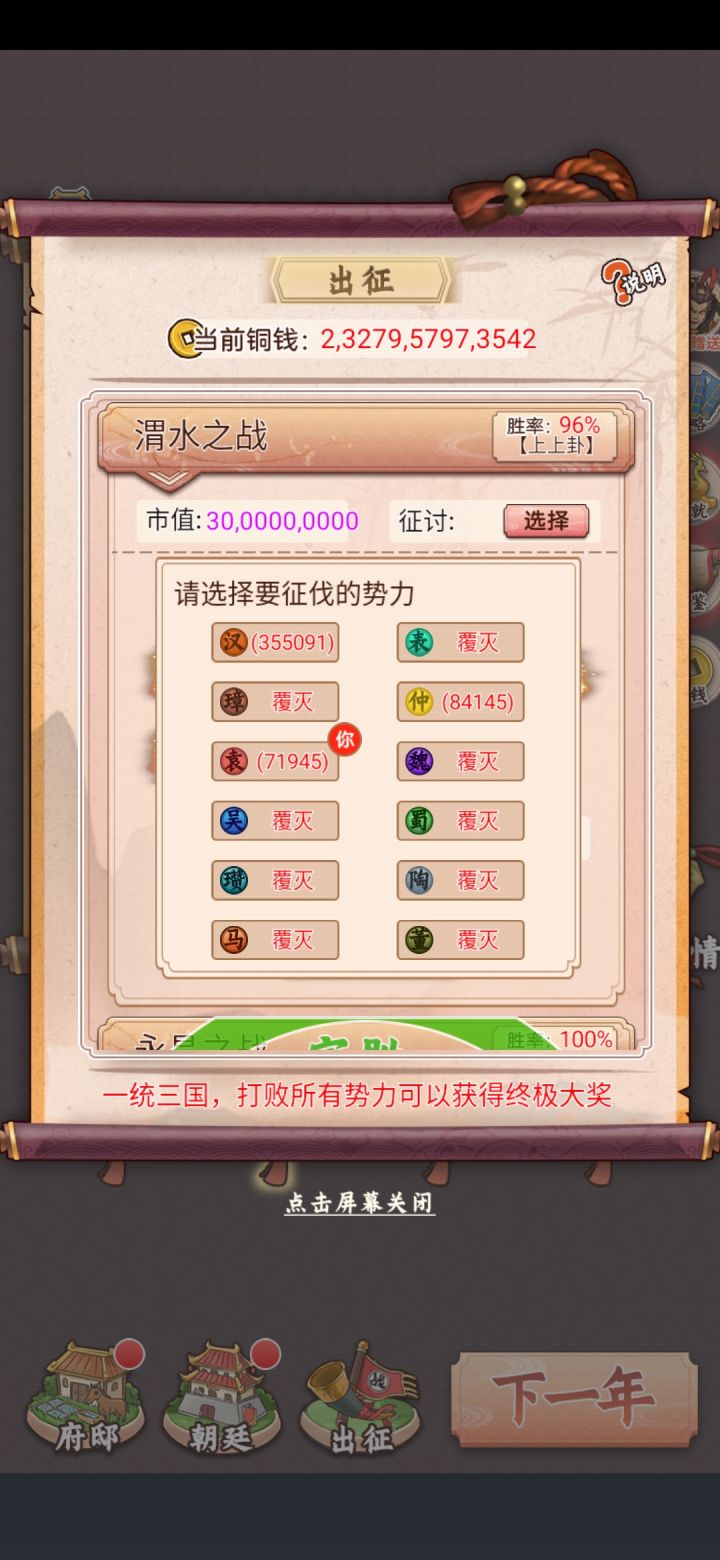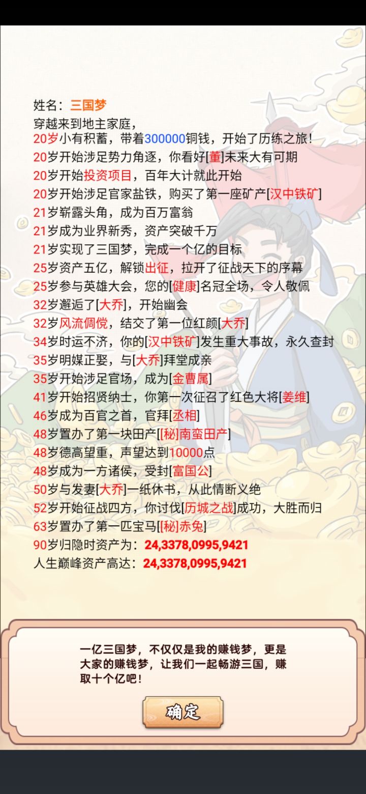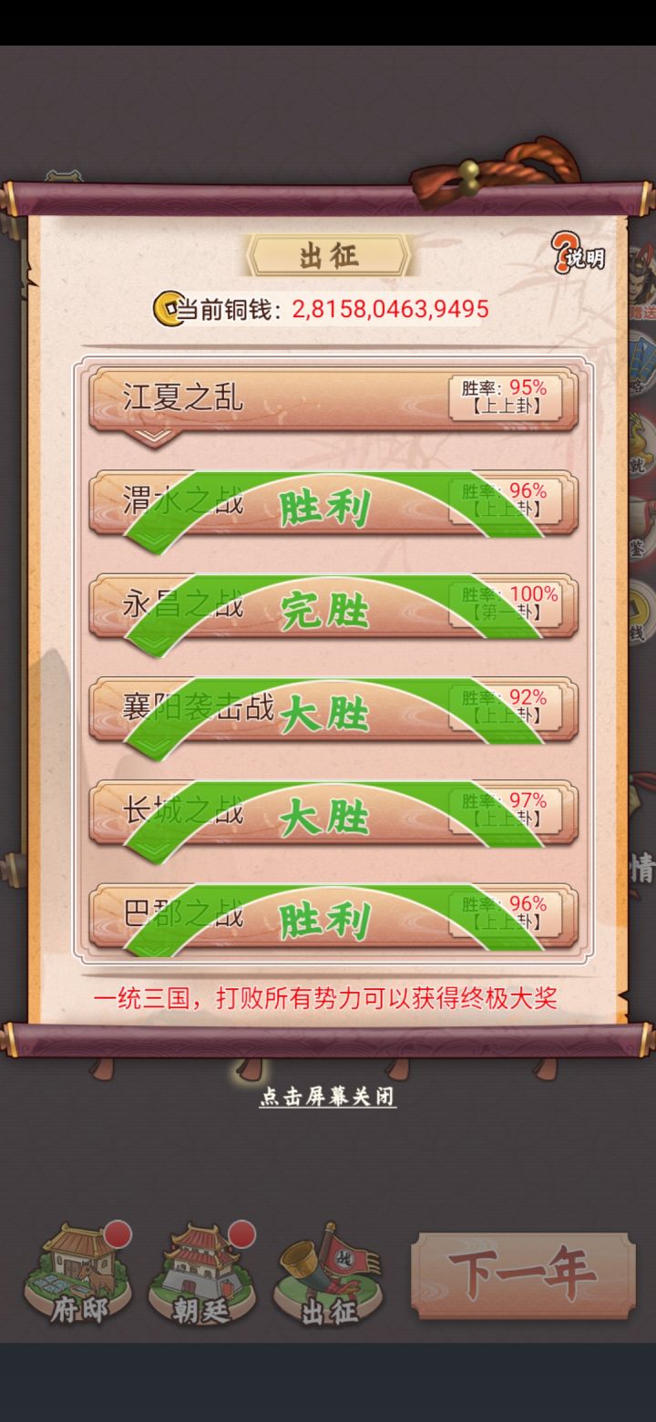 开局挖宝五千万,刷新货物到五亿开启征战天下。六十一岁一统天下(几次手误没出征就点了下一年不然还能早一点),之后后宫红颜领红利,优哉游哉的养老生活。说下建议,出征可以在一统天下后出个开疆拓土,或者攻打他国,不然出征卡那里,我一统天下后兵马刷新好没有打的目标,一下子就兴趣缺缺。还有矿真的有点鸡肋,封矿几率太大,建议封一年活着两三年的加入全开采策略里面。最后希望多出一点美女