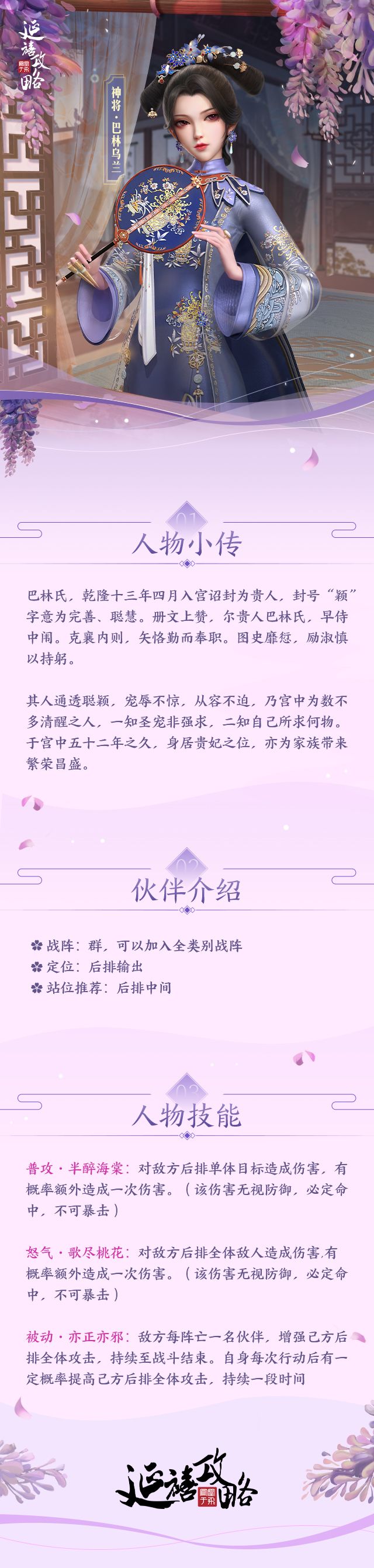 各位佳人,见字如晤。古卷有言:“其出弥远者,其知弥鲜。”红墙之下便有一妙人,她为知所求、外有所得,拒绝凭外力牵引谋事修心,因而得以在众人窥牖之时,守得一方自在天地。她便是巴林乌兰,亦是后来身居贵妃之位、敕旨加封的颖贵太妃。全新至臻神将·巴林乌兰即将上线,佳人快随小管事一起,认识一下这位聪颖通透的妙人吧!文末还有互动福利相赠哦~-各区服活动时间--活动规则-1.活动期间,佳人可使用全新活动