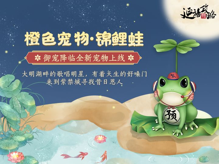 各位佳人,见字如晤。皇家御宠苑近来传出一则消息,称有一歌唱明星前来寻找往昔恩人,它的小粉丝也随之而来,在湖畔边收集了不少幸运草,以呱呱声装点整个盛夏。6月28日,橙色宠物【锦鲤蛙】、紫色宠物【小青蛙】即将上线,小管事带来了两份获取情报,佳人快一起看看吧!壹 · 御宠降临 · 锦鲤蛙6月28日更新后,【御宠降临·锦鲤蛙】活动即将开启,佳人达到85级后,可前往【活动】-【活跃福利】-【御宠降临