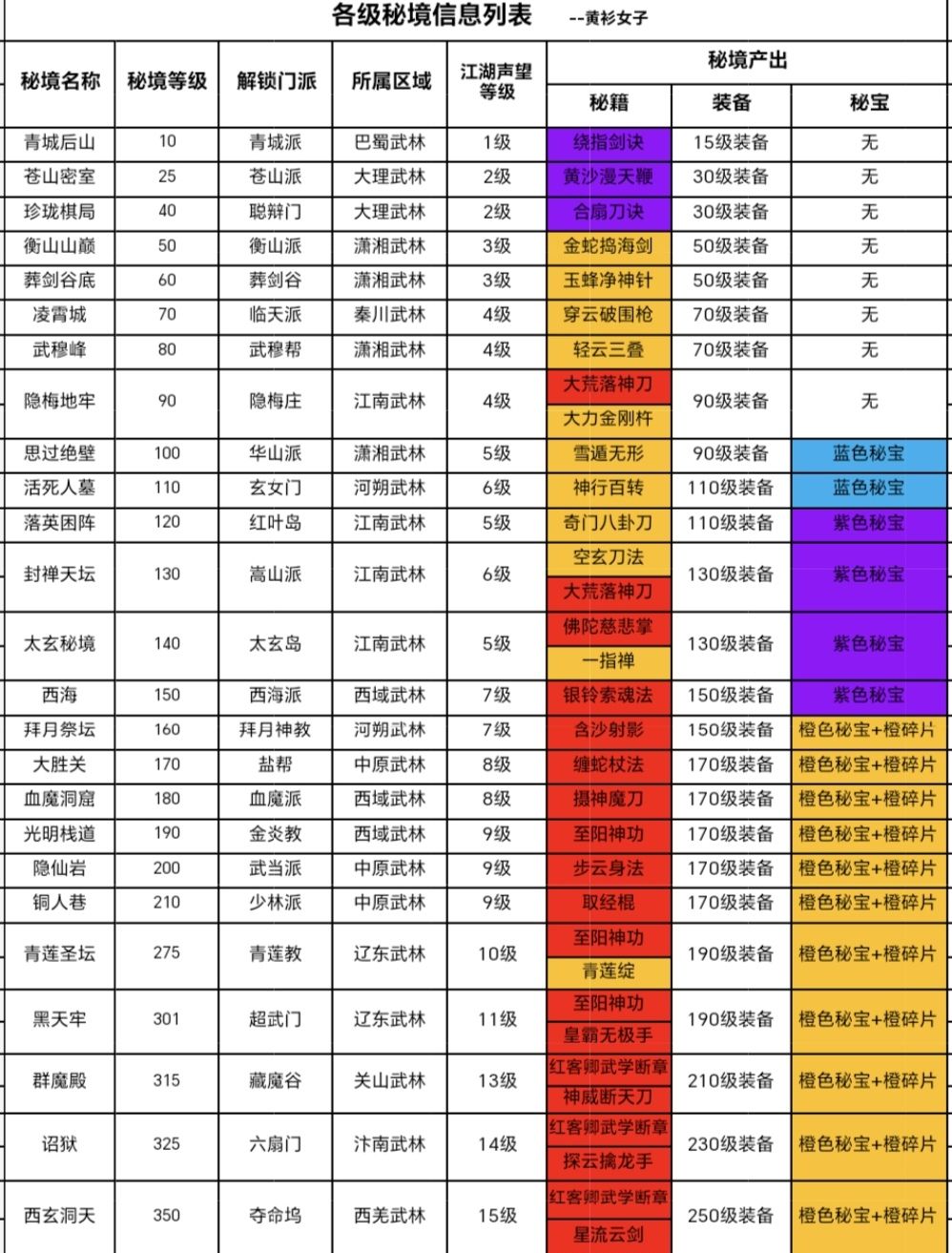 最近看到很多萌新想刷某本秘籍或密宝,不知道哪里产出,本人汇总了下各个秘境的产出明细,供大家参考,想刷哪个秘境可以提前做规划。 --黄衫女 2023.10.19