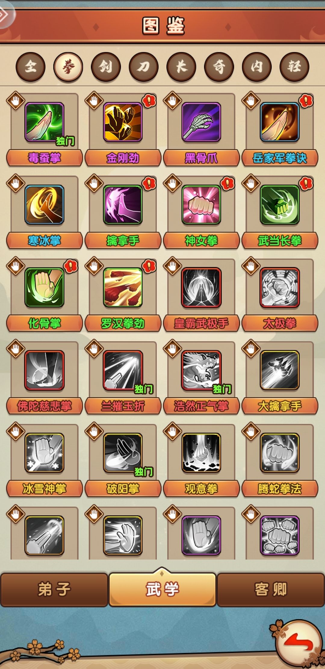 很多人已经讲了新人如何入坑、如何选弟子、积累资源,我来给萌新们讲一讲门派,讲一讲武学搭配。请注意,这里我们只会讲一些平民在前期能够真正拿到手、使用到的,红武暂时不讲。 【拳法】 特点:打前排,对象少、重防御。 定位:肉盾、控制 简评:这个很好理解,胳膊就那么长,拳也打的不远。绝大多数拳法都是针对前排,在红色武学以下,逍遥打残血,腾蛇和折梅打随机,其他的基本上都是攻击前排。推荐几个好用的拳法: 1.