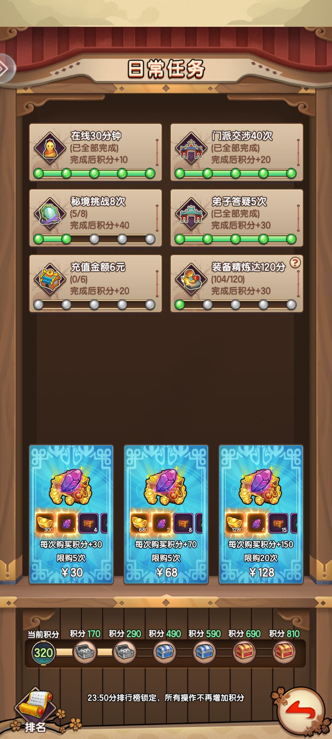 游戏七天过后,开始了一些活动玩法,该怎么玩,在这里做下简单讲解,以及一些技巧和重点。 首先,今天又出了红弟子谢去病,什么情况呢,后面在说,因为有个更重要的事情,日常任务活动,这个每天都有,但因为这是红弟子傅无悲除了v15的获得唯一途径,我前篇有提过,这游戏红弟子分两种,一种是傅无悲,一种是其它红弟子,或许夸张了,但也足见他的强度,这个弟子没办法白嫖,但是也有方法花多点时间,花少钱去获得。 怎么