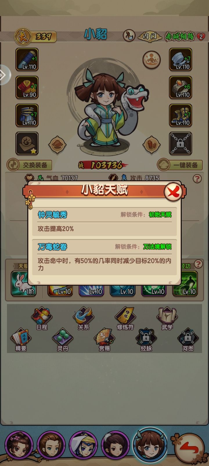 首先,这游戏最重要的战力部分,是送礼物,送礼物达到内门开第三技能栏,到亲传技能cd减一回合,不同颜色的弟子需要的礼物天差地别,还有,升级突破需要的材料也天差地别,越往后越是如此,所以前期开局,不要太沉迷于紫色以上的弟子,不然就是氪金大佬都直呼吃不消,有钱也没必要呀。所以,开局第一点,选个主力推图,用绿的,小宋,小宋用剑的,而前期最容易拿到的随4功法是太乙剑,小宋天赋也加攻,所以选他,然后给他配置