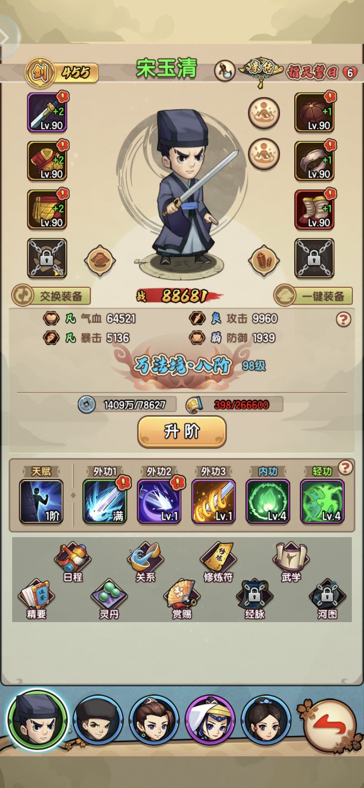 大家好我是九区的幽明谷,我从接触这个游戏体验了好多个角色的培养,从宋-大雕-郭靖-宫本-胡斐(白震云)-小宝,几乎把大部分平民主流角色都玩了一个遍,现在把自己体验之后的心得和强度理解分享一下。先说角色强度维度,玩到中期阶段我认为角色强度从3个方面决定:1.面板属性, 同样级别的角色基础属性差距并不大,造成属性差异里有很大一部分是侠缘,最明显的就是小宝的侠缘是太子和红色冷血,这两个基本很少有人用,