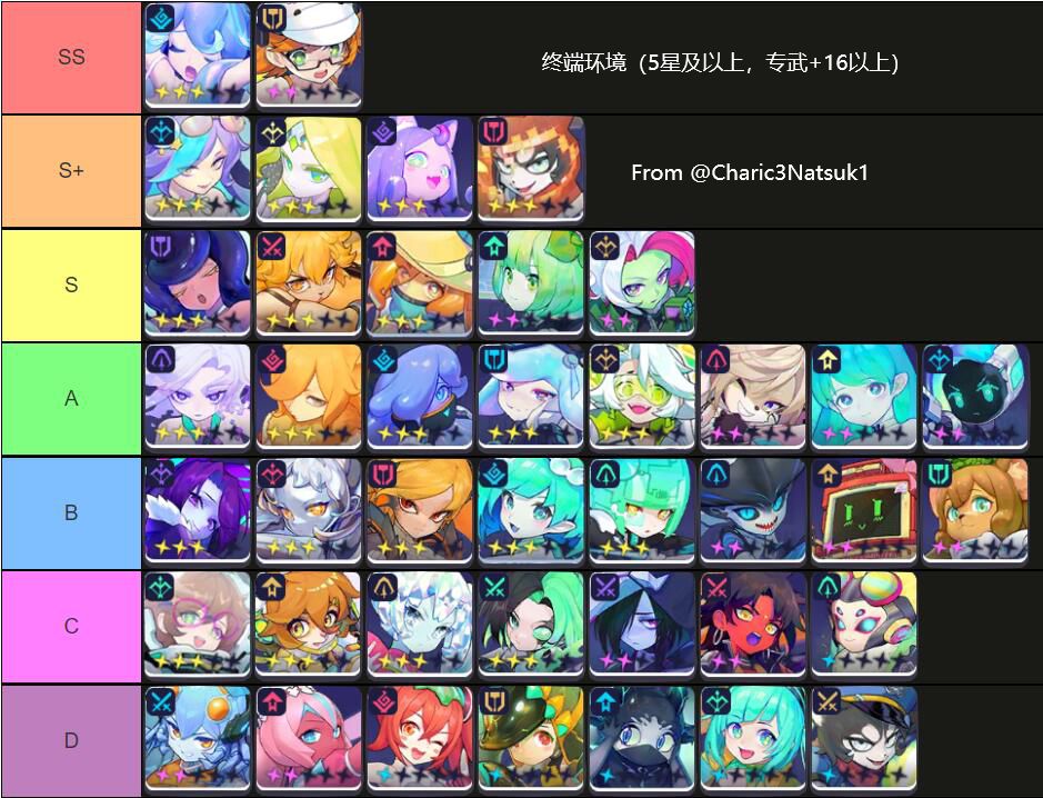 充电时代,沸腾期待! 叠甲环节: 1.这是国际服,这是国际服,这是国际服。国服玩家左转。由于国际服已经开服近两个月,基本上主力已经拉到满中之满,所以一切的讨论都以此为基准。 2.接上条,榜单基于终端表现(主c角色130级以上,5星以上,专武+21以上;辅助角色120级以上,5星以上,专武+21以上)进行评分,不代表开荒环境与之符合。 3.很多卡我用得很少,如果你觉得某个角色会有更好用的地方,那你的