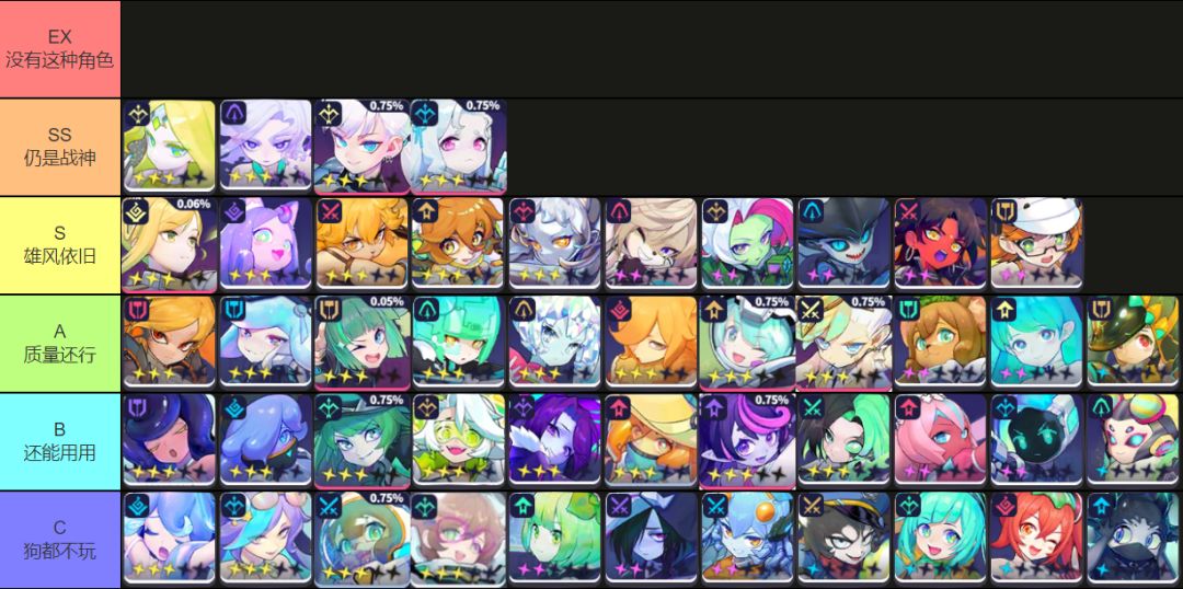 叠个甲:很多角色我用得不多,如果你觉得某个角色会有更好用的地方,那你的见解是正确的,坚持自己的信念和XP玩下去才能开心。 内容基于海梦之语1期卡池,适用练度范围为专武+16,120级以下,跃迁1以下 部分参考国际服当前环境进行未来视排序,到时可能有出入,请以国服为准。 榜单如下: 虚往上提一级,我懒得改了 新卡简评: 火贝基 S+ 现在已经是调整之后的,跟姬露露比起来更倾向于恢复,奶量夸张,回能锦