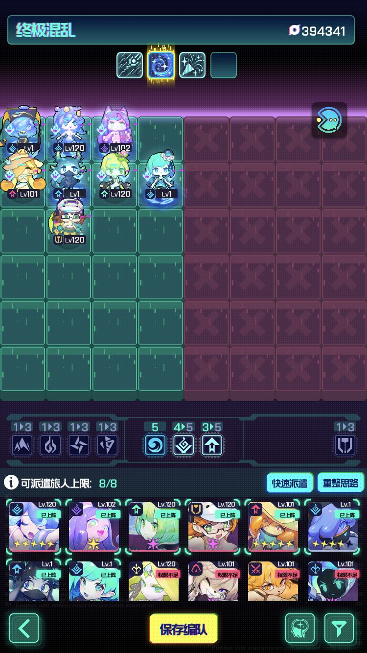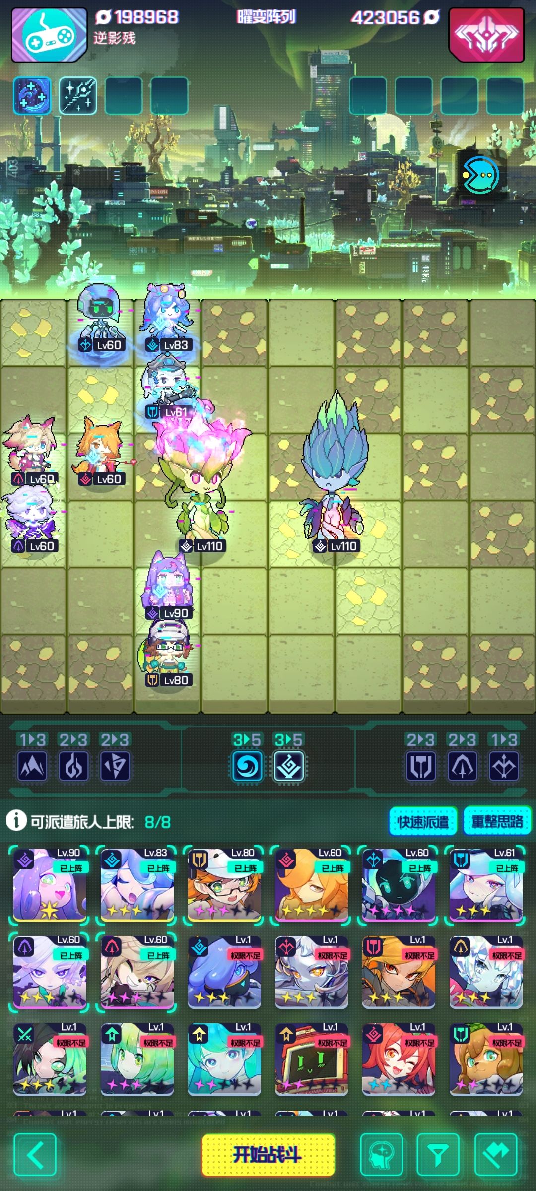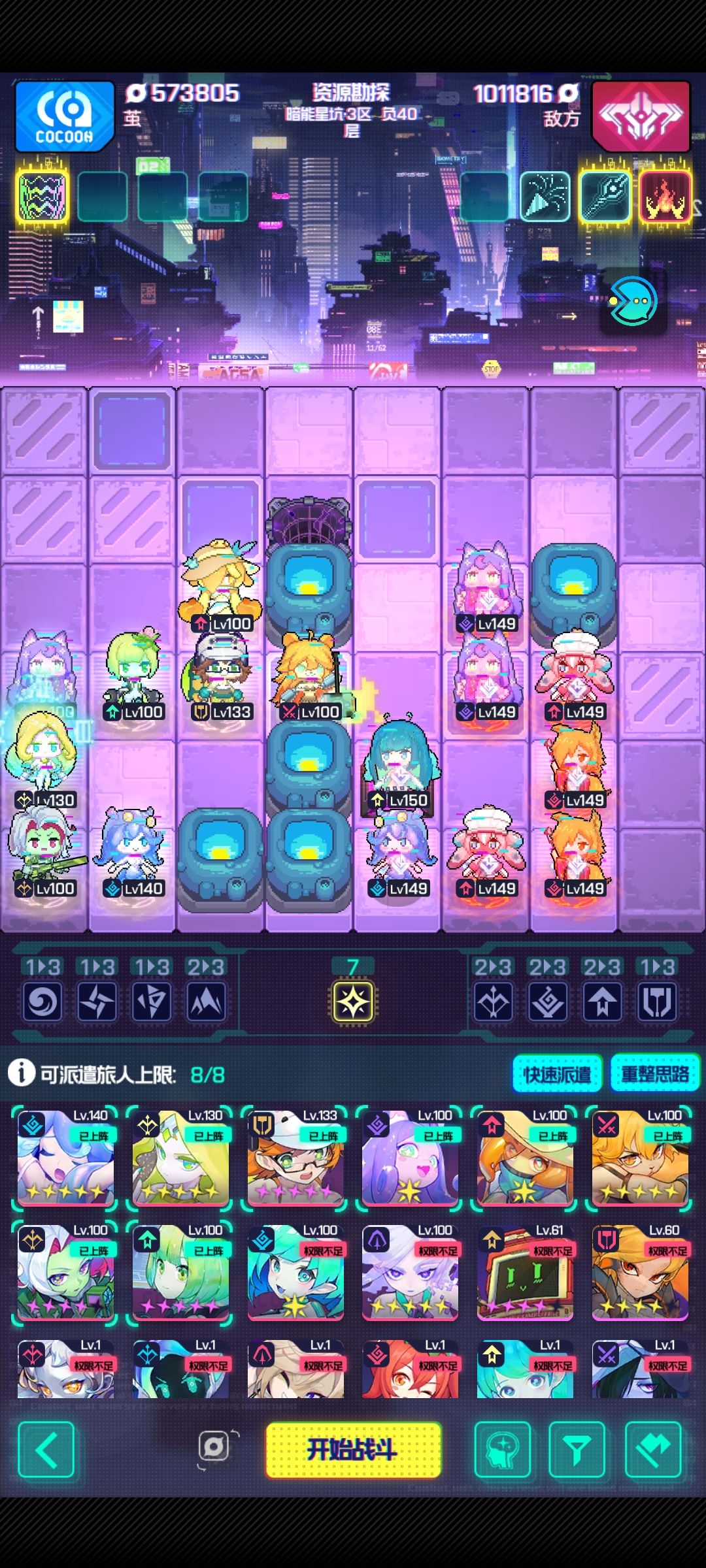 第三天了。卡在4-32。摆位置貌似没什么用,前排扛不住,俩刺客暴毙。 看论坛之后,决定屯资源。所以除了任务,几乎没有抽卡。用着最有限的角色。 可以看出来。我用的是3暗+5光的阵容。因为暗没有5个,其他角色太多单一属性。除非凑4水,4火,4风之类的。要不然,凑不了5属性羁绊。所以我选择凑5属性的光,然后让老板娘变大。 虽然老板娘能量放的很慢,不过超大范围伤害还是很香的。美中不足的就是,老板娘临死放大