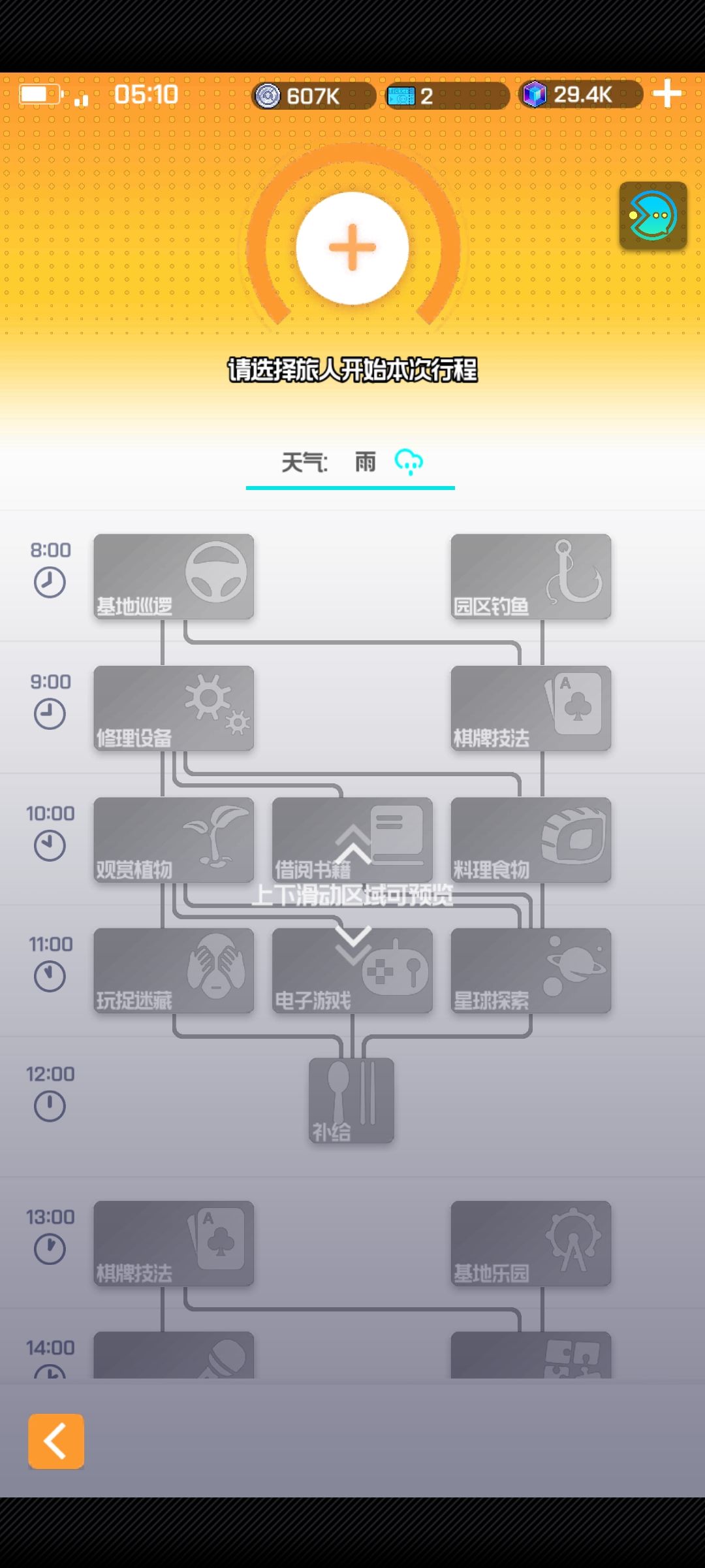 行程中心简述一览 行程中心最主要的作用为,角色碎片获取。 每天拥有两次免费机会 上下滑动,可预览活动流程(此时并无实际意义) 选择角色之后,会进入正式的页面 精力:请理解为行动值,注意精力不能为空,精力是第一优先考虑的事情,一旦精力为0,本次行程便会结束。 心情:分为没劲\一般\高昂,心情的好坏会影响进行行程的过程中,报告最优出现率。 同行旅人:在行程的过程中有概率遇到同行人的加入,加入同行者,会