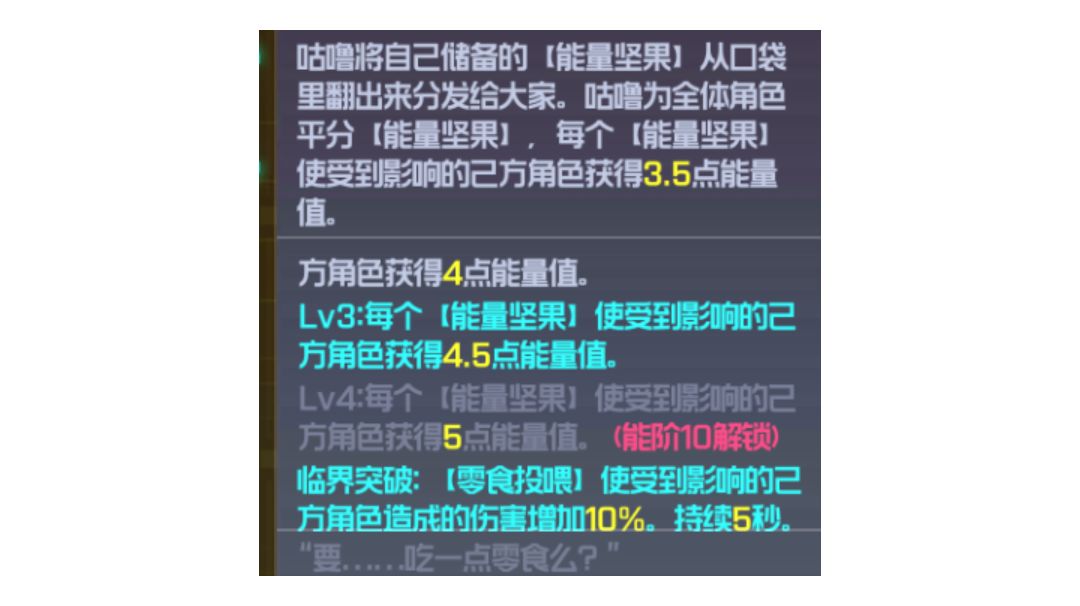 为什么要说不完全版测评呢?这是因为咕噜的技能浮动太大,我只能尽量测出一些粗略但是较为稳定的数据 老规矩,先放技能图 咕噜两格能量(2000) ————————分割线—————— 可以看出咕咚回能量来源于坚果的积累 终结技就是为队伍会能量的开关 那么可以列出等式 回能量=积累坚果×5(跃升后×6)=常规攻击(25)+开局(10)+每三秒自然累积(20)+队友放终结技概率获得(150×30%)+跃升后