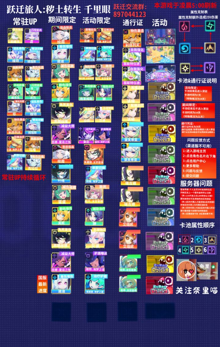 我突然想起来要更新了!!!!!国服最新进度:限定池:迪迪(复刻) 活动池:姬露露.海梦之语(复刻)通行证:帕奇.太空音律废弃卡池:「镜中仙花」黛芙蒂娅「炽焰抱梦」艾璐妮