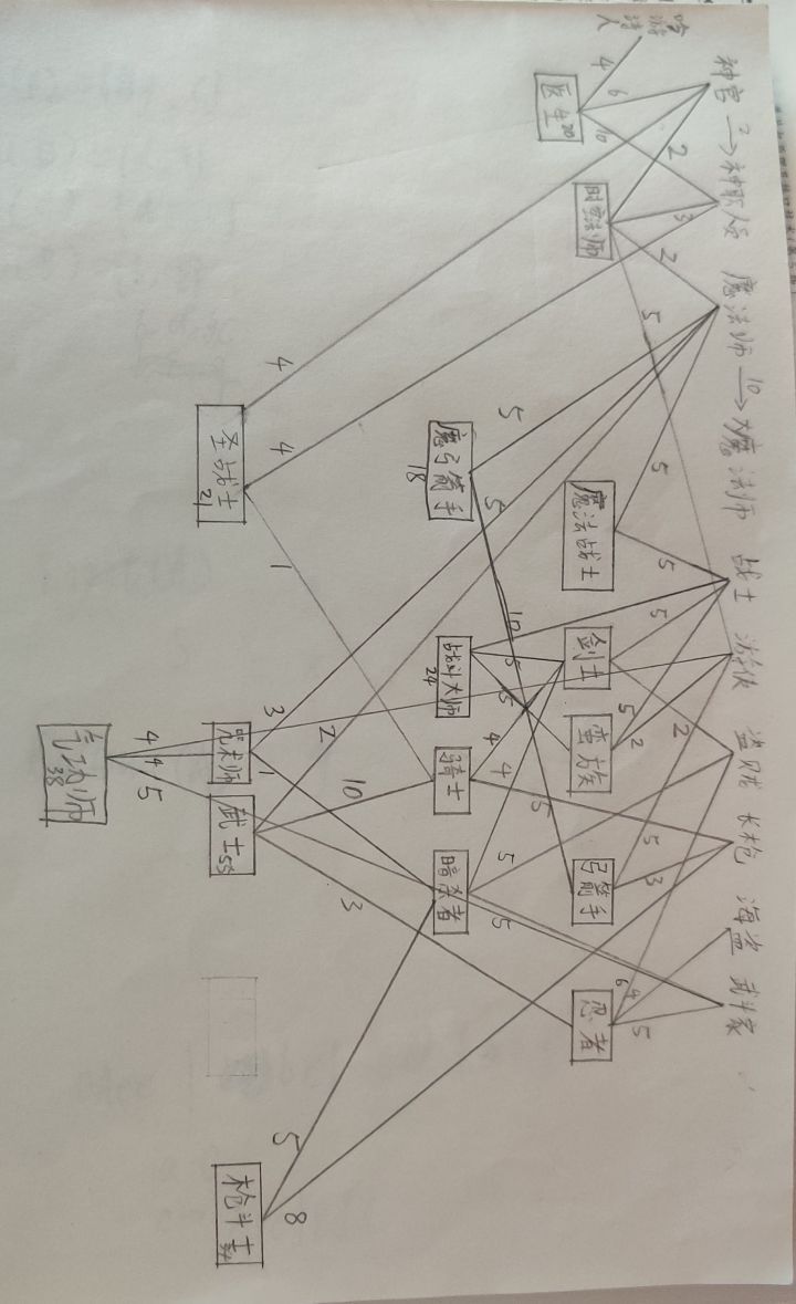 神官2=神职人员魔法师10=大魔法师战士5+魔法师5=魔法战士战士5+盗贼2=剑士游侠2+战士5=蛮族魔术师2+游侠5+神官2+神职3=时空法师盗贼5+剑士4+武斗家5=暗杀者游侠5+枪3=弓箭手长枪5+剑士4=骑士骑士1+神官4+神职4=圣 战士忍者,海盗4级,武斗家5级,盗贼6级武士,魔法师2级,骑士10级,忍者3级战斗大师,战士10级,剑士5级,蛮族5级魔弓箭手,弓