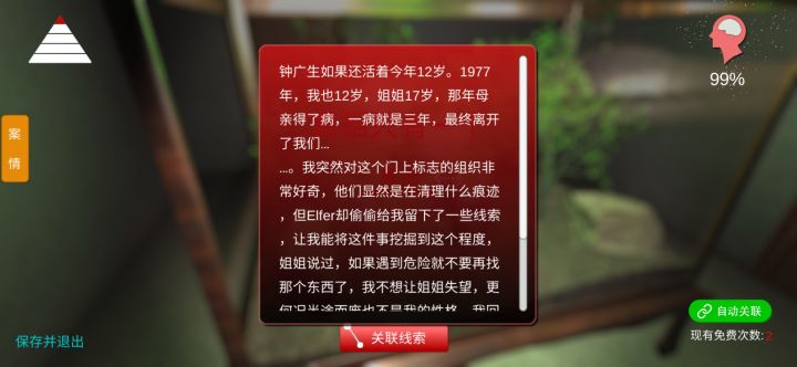 累死了,眼都快花了!有些东西是真不好找!太隐蔽了!有时候蹲地上,一点点的找,而且有时候找到了还点不出来!还要换个角度!可是一动。线索可能就没了!然而继续蹲地上找。有时候要对着一堆虫子里找!对我来说,那些虫子实在受不了。目前99通关,通关后查攻略,发现差的1个线索是个蜘蛛?点蜘蛛掉下来的血?反正实在点不出来,我也不想在虫子堆里一直点点点了,就这样吧…