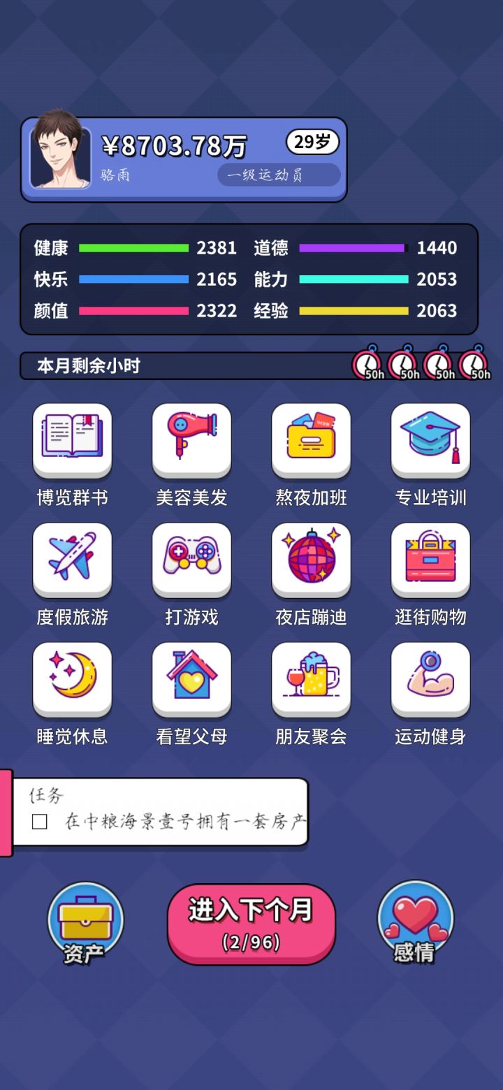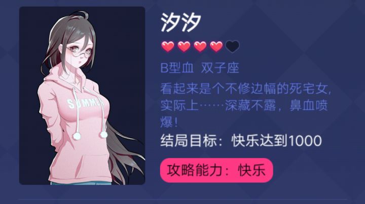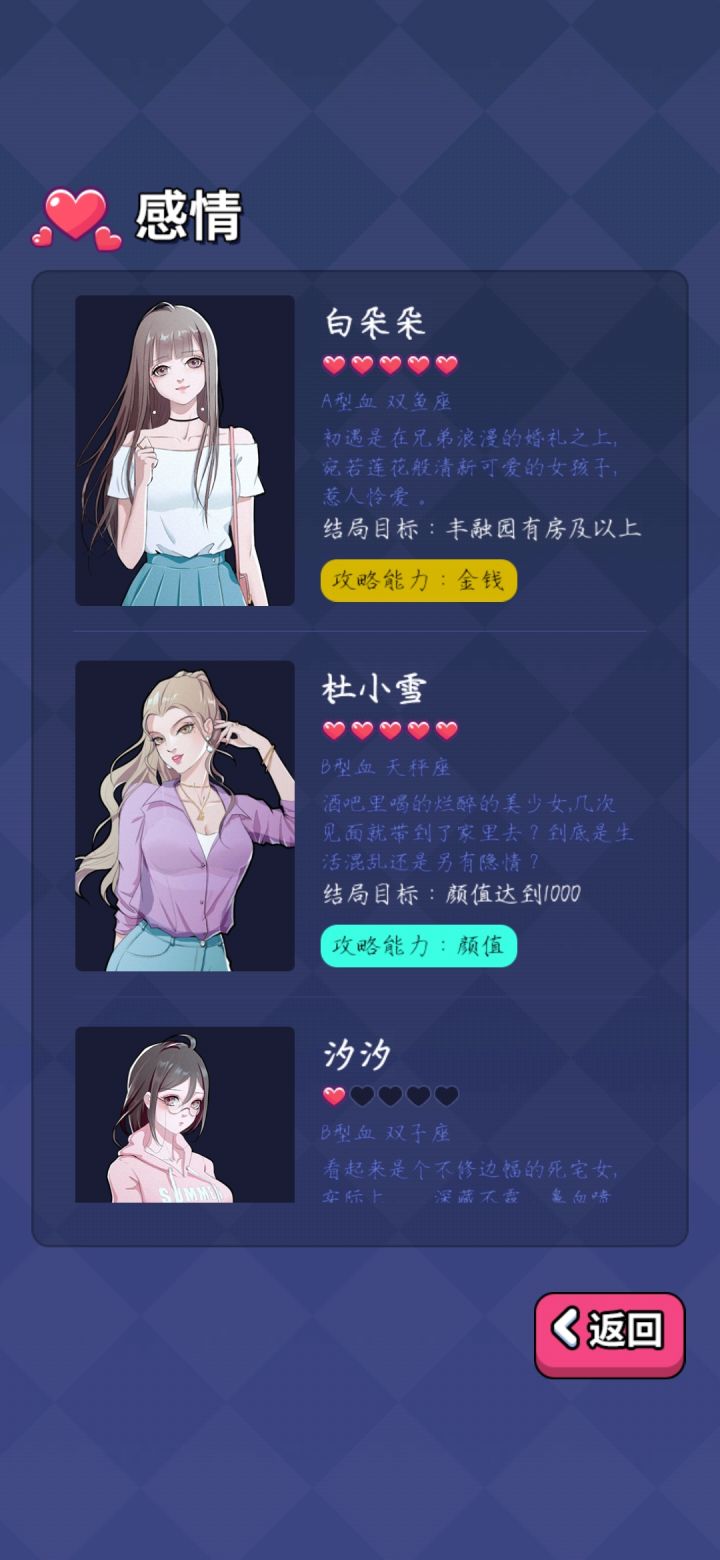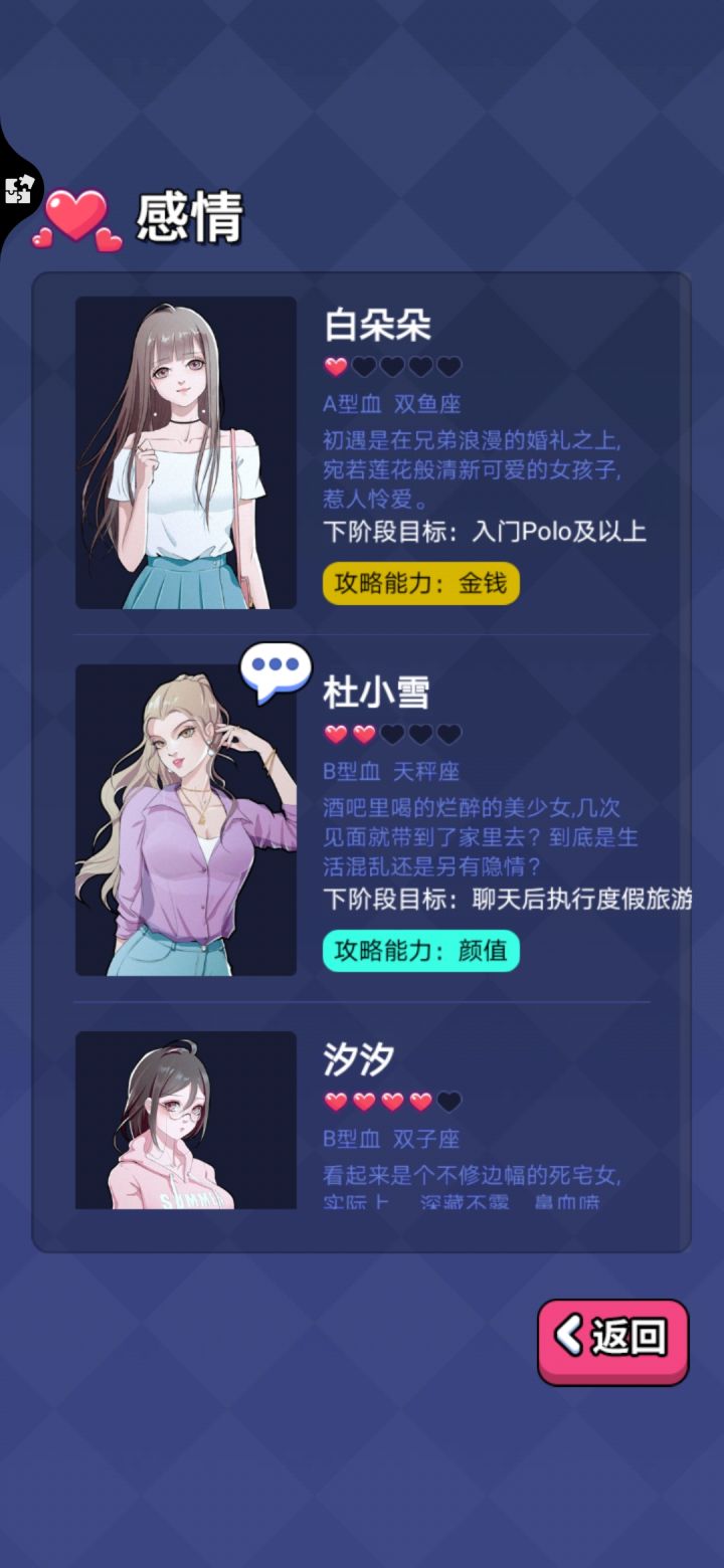 能力设定过于固定,工资也好固定,想要赚到钱就得搞投资,不看广告刷下来感觉体感一般。攻略人物挺迷的……玩男版的感觉给攻略的女大概属性的有拜金、颜控、游戏宅、白领,后两者没打过,不做评价,前两个刷起来不太舒服玩女版的明显攻略简单了,但可攻略人物设定也奇怪得很。拿的玛丽苏剧本吧……还有四个攻略角色之间没有互斥😅给整笑了,以为攻略完一个再去攻略另一个会有啥互动剧情结果只要后攻略的那个攻略条件达成就直接把前者挤掉???好家伙