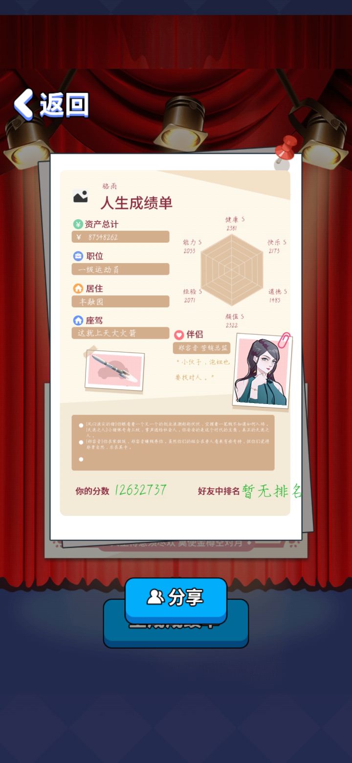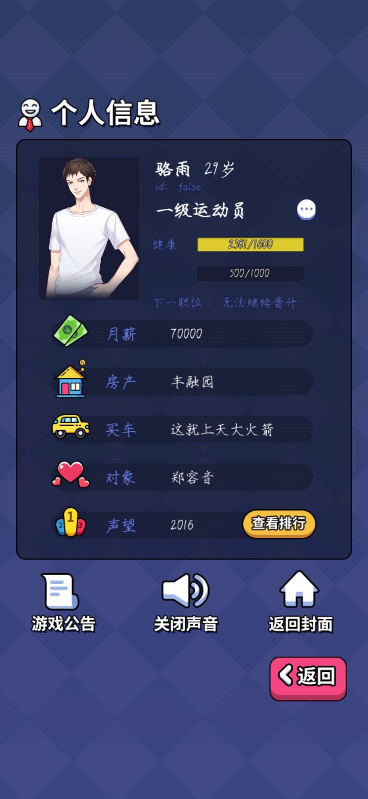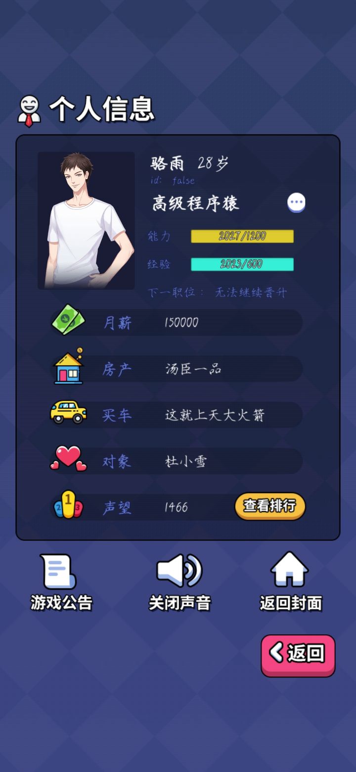 能力设定过于固定,工资也好固定,想要赚到钱就得搞投资,不看广告刷下来感觉体感一般。攻略人物挺迷的……玩男版的感觉给攻略的女大概属性的有拜金、颜控、游戏宅、白领,后两者没打过,不做评价,前两个刷起来不太舒服玩女版的明显攻略简单了,但可攻略人物设定也奇怪得很。拿的玛丽苏剧本吧……还有四个攻略角色之间没有互斥😅给整笑了,以为攻略完一个再去攻略另一个会有啥互动剧情结果只要后攻略的那个攻略条件达成就直接把前者挤掉???好家伙