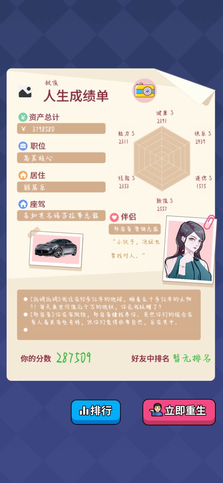 这游戏挺简单的开局选96月的选空余时间多的职业然后一直加班培训能力够了就选高管核心或院长(空余时间多)可以开始叠其他属性数值主要靠投资赚钱,那点工资到中后期啥也不是房子最贵是北京尊府,座驾是火箭————————角色攻略————————白朵朵:礼物选最贵的,其他按游戏提示————————————————————杜小雪:选择抱她上床,其他按游戏提示—————————————