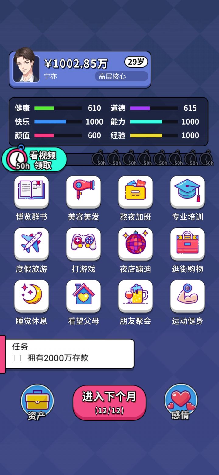 能力设定过于固定,工资也好固定,想要赚到钱就得搞投资,不看广告刷下来感觉体感一般。攻略人物挺迷的……玩男版的感觉给攻略的女大概属性的有拜金、颜控、游戏宅、白领,后两者没打过,不做评价,前两个刷起来不太舒服玩女版的明显攻略简单了,但可攻略人物设定也奇怪得很。拿的玛丽苏剧本吧……还有四个攻略角色之间没有互斥😅给整笑了,以为攻略完一个再去攻略另一个会有啥互动剧情结果只要后攻略的那个攻略条件达成就直接把前者挤掉???好家伙