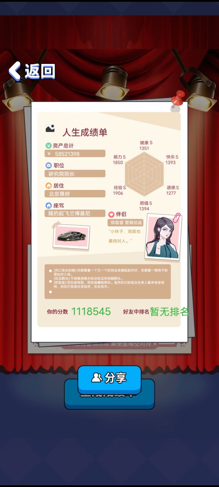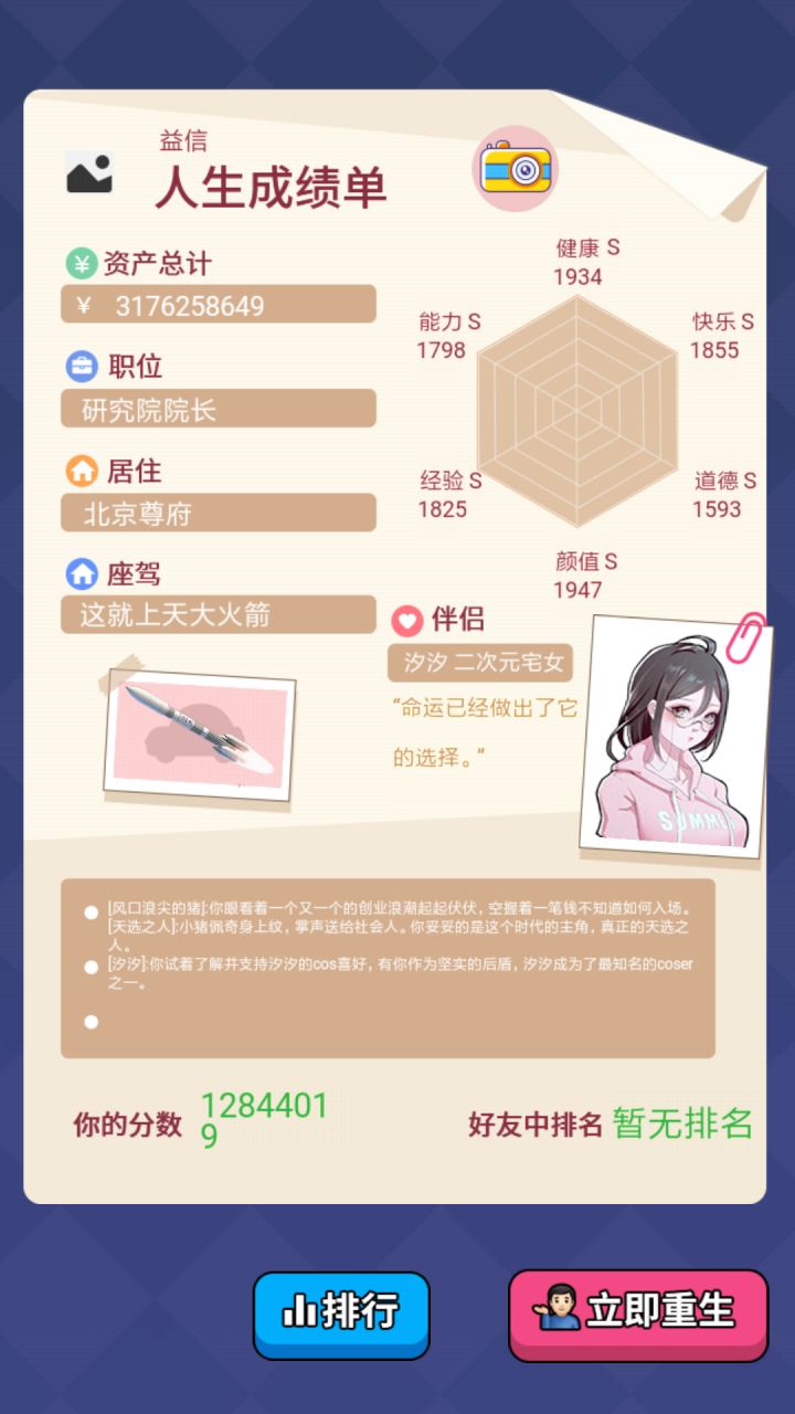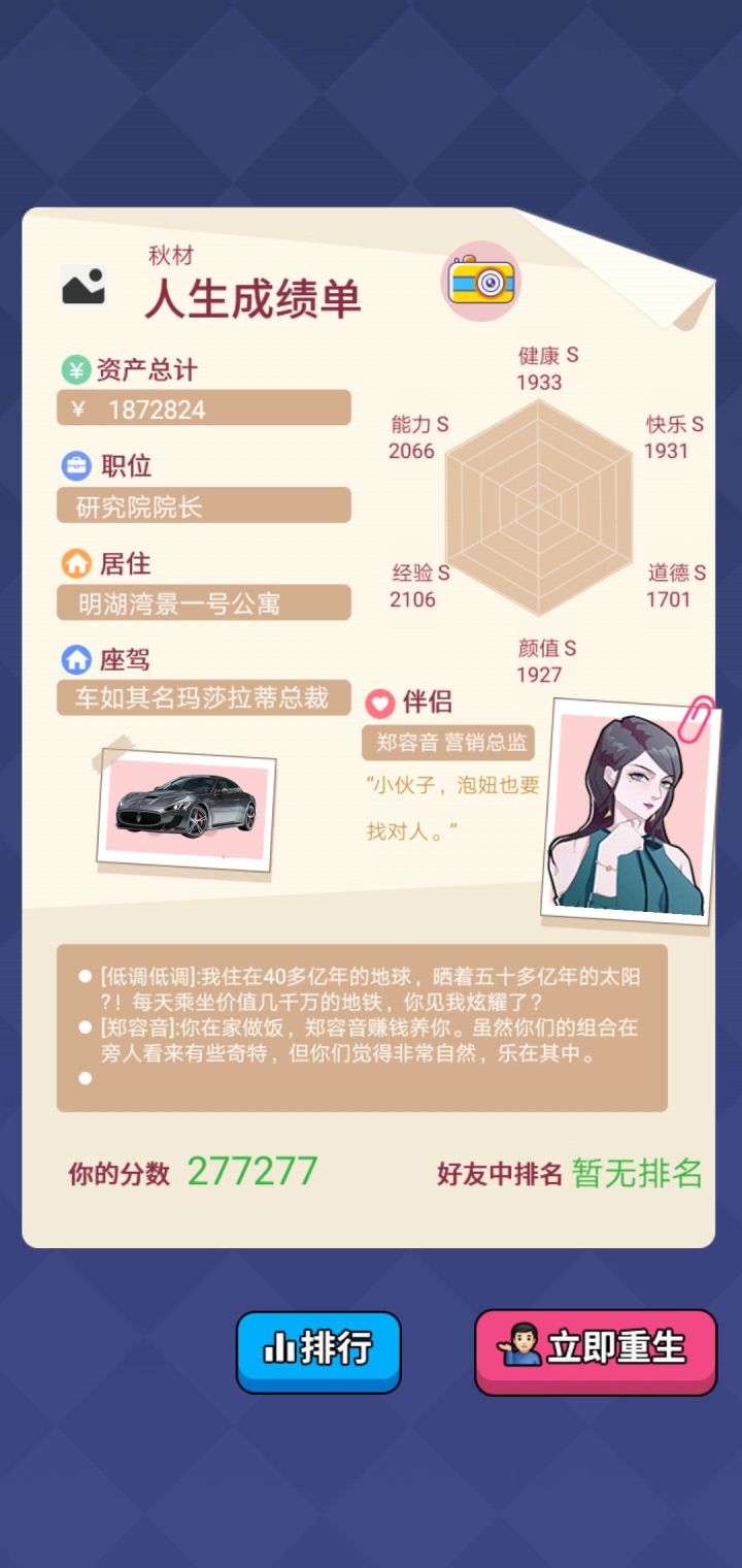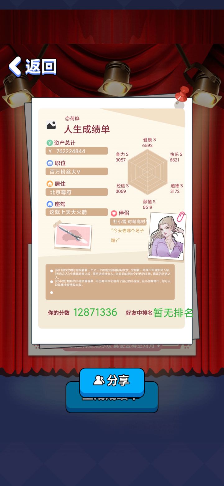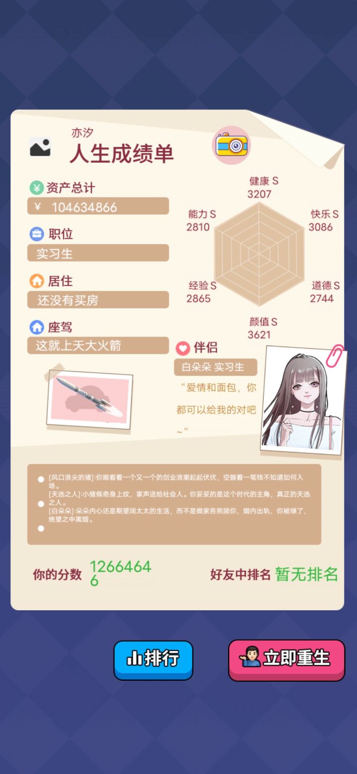 这游戏挺简单的开局选96月的选空余时间多的职业然后一直加班培训能力够了就选高管核心或院长(空余时间多)可以开始叠其他属性数值主要靠投资赚钱,那点工资到中后期啥也不是房子最贵是北京尊府,座驾是火箭————————角色攻略————————白朵朵:礼物选最贵的,其他按游戏提示————————————————————杜小雪:选择抱她上床,其他按游戏提示—————————————