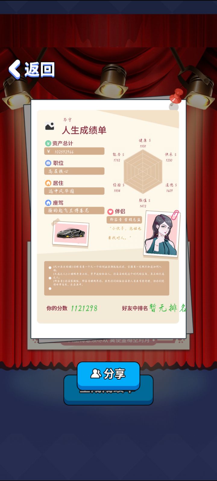 这游戏挺简单的开局选96月的选空余时间多的职业然后一直加班培训能力够了就选高管核心或院长(空余时间多)可以开始叠其他属性数值主要靠投资赚钱,那点工资到中后期啥也不是房子最贵是北京尊府,座驾是火箭————————角色攻略————————白朵朵:礼物选最贵的,其他按游戏提示————————————————————杜小雪:选择抱她上床,其他按游戏提示—————————————