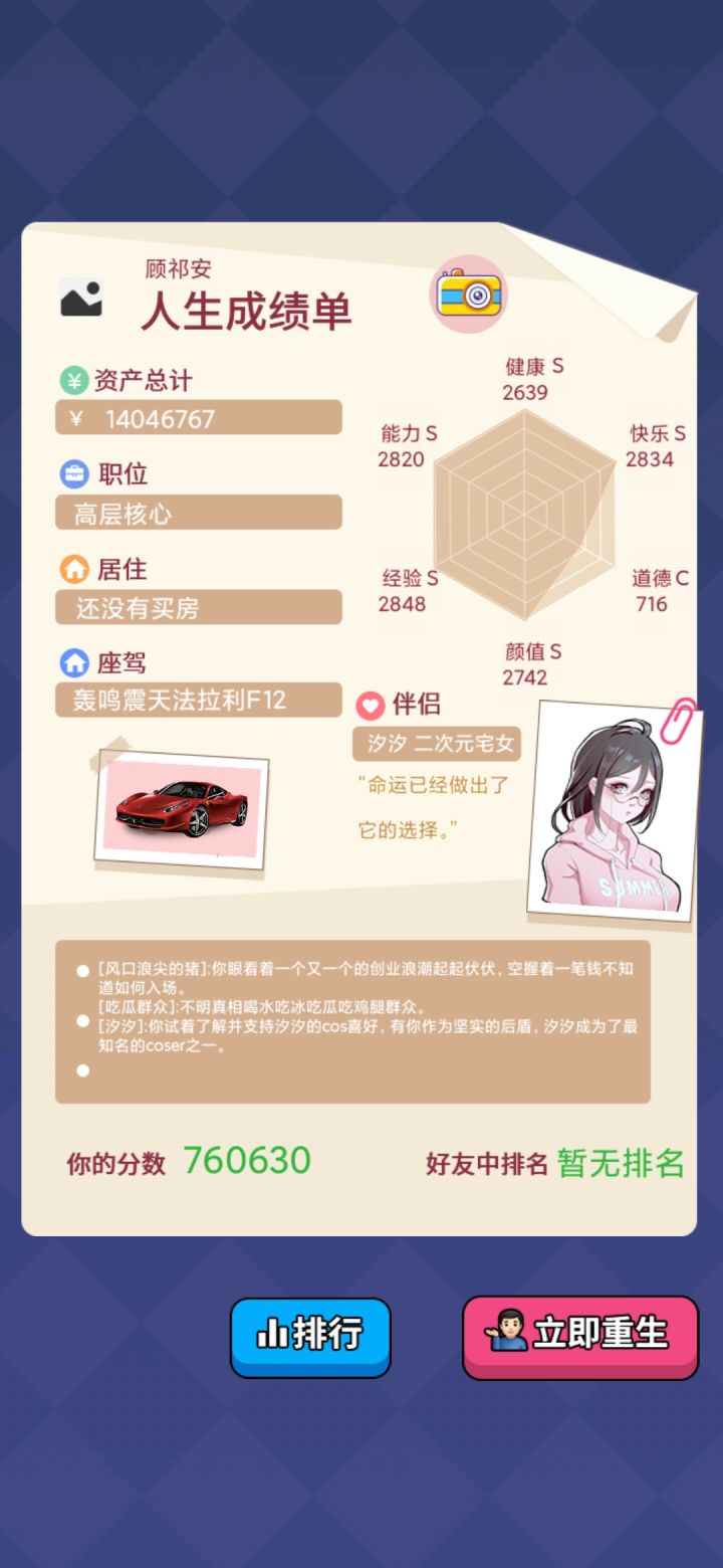 第一次玩感觉白手起家最容易,前期加班,5w开始投资,然后加班和培训到20万左右,前期工作选空闲时间比较多的,等升职到最高级别就疯狂投资,然后就可以瞎弄了,金钱轻松破10亿四个恋人亲密度满