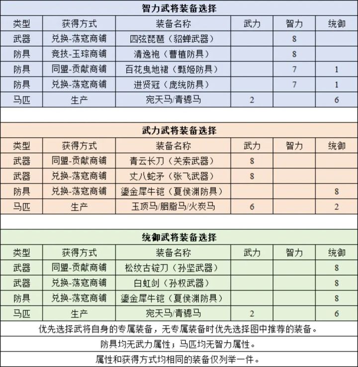 前言装备可以提供基础属性以及装备精通,是提升战力的重要手段。本文将通过简单分析,帮助玩家正确选择装备。一、选择装备的思路所有1级金色装备均提供8点基础属性,各项基础属性的作用如下:武力:加成物攻和物防。智力:加成策攻和策防。统御:加成生命值。运气:加成命中和闪避(已被砍废)。魅力:无作用,废弃属性。二、装备选择表建议保存该表,作为选择装备的参考。——————五千年交流群:4