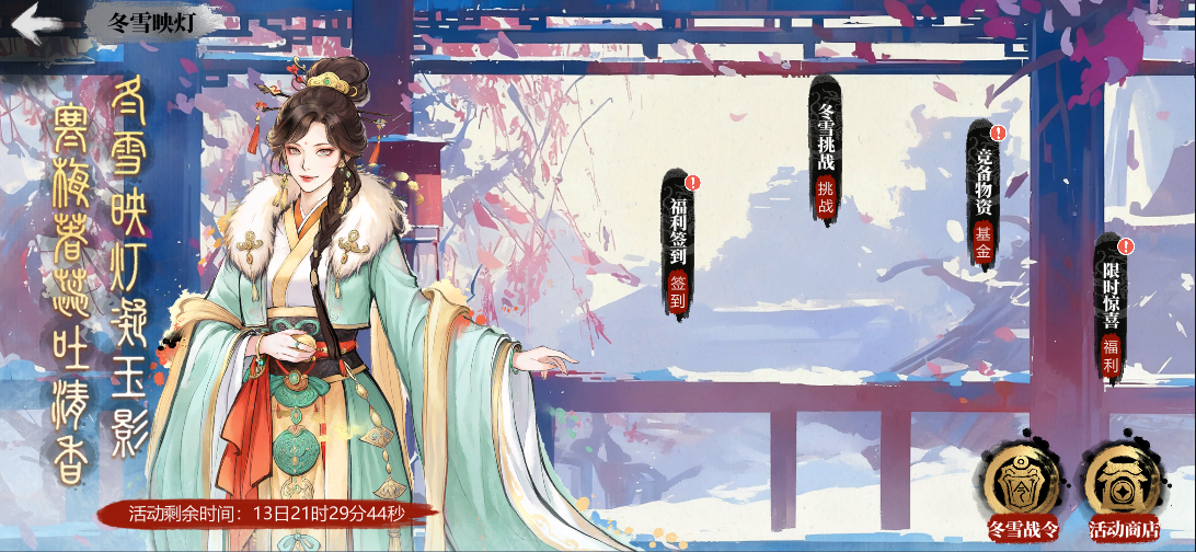 主公们大家好呀。我是小小五千年工作室的长安!全新的内容和活动即将上线,快一起来看看吧~如对游戏有任何建议和疑问,请第一时间加入我们的官方QQ8群:935398576。并联系我们的客服“火火”。以下是本周更内容主题活动丨“冬雪映灯”正式上线! 活动时间:2025年12月12日~2025年12月26日12:00。活动范围:满足等级大于或等于30级的玩家均可参与。●本期专属奖励:活动