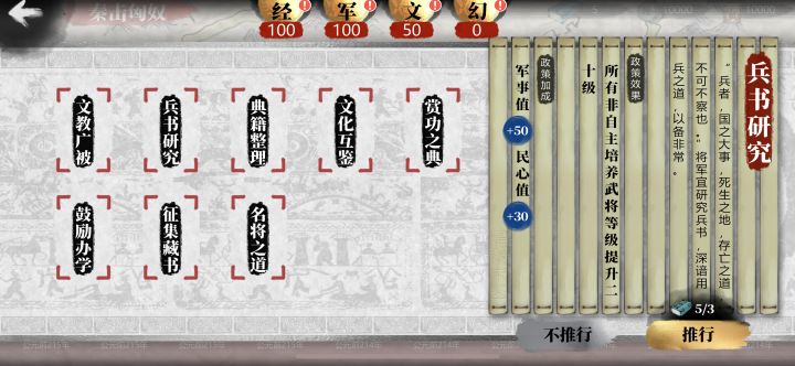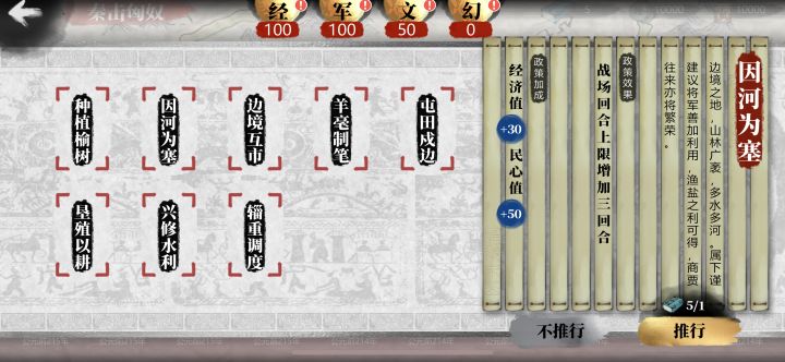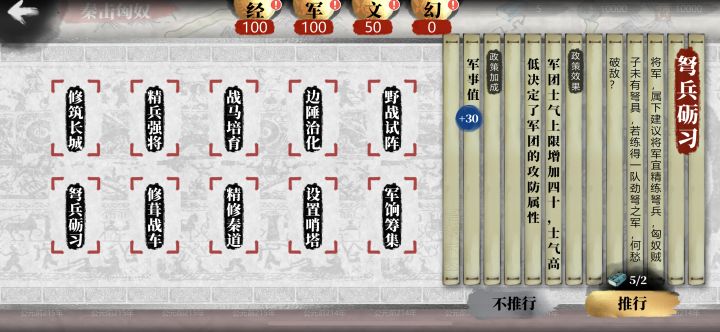 1.有幻想将根本不用考虑加点问题,直接每队上幻想将平推即可,别忘记完成精英任务的条件。2.非幻想将赵击匈奴起始政令点略少,秦击匈奴和汉击匈奴起始点比较多。但总体问题不大,我个人推荐的加点顺序没有大的变化。3.起始第一关准备:全加政令点,起始钱粮10000,阵型足够布满三个队,建议布阵为第一排盾(保证防御),第二、三排策(保证补血),第四、五排枪(保证攻击)。4.第一关结束后,建议政令点全加5