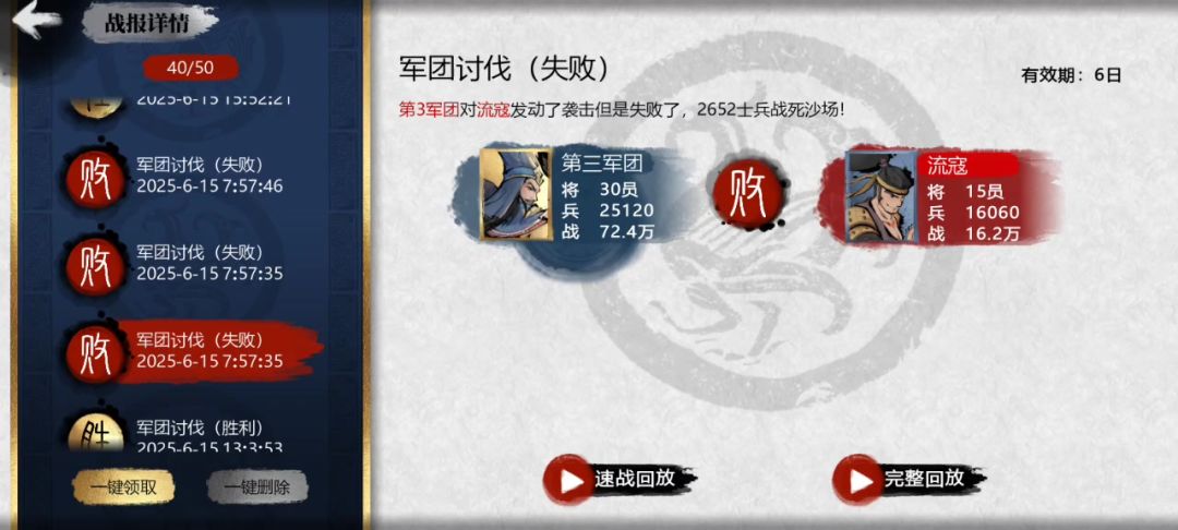 1.速战回放和完整回放都是赢,而且差距还非常大,我1个部队都没打死。为啥那里写的“败”? 2.为啥那些战报删不掉?重新启动了之后,还是那样。 首先,我网络很好。 可能我点击讨伐之后,改了军团将领,所以才显示出现了问题。 所以要怎么删除战报? 详情请看视频!!! #小小五千年 #小小五千年随机卡问题 #小小五千年攻略 #小小五千年氪金 #小小五千年