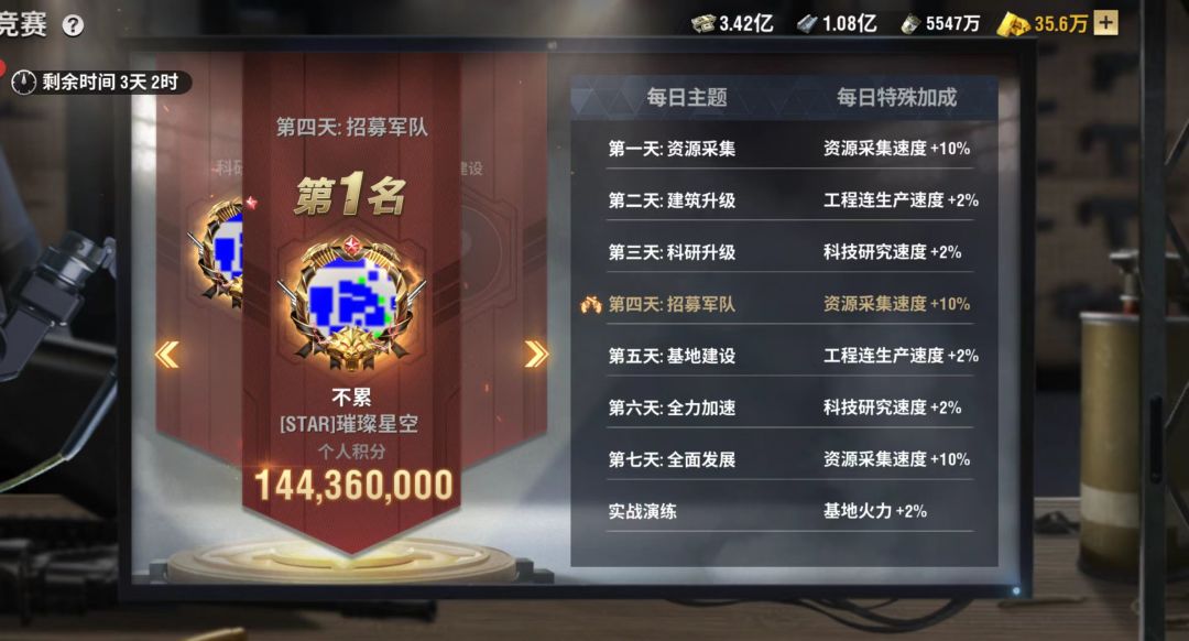 周三,军备主题:科研升级 积分:880万 0:00~4:00辖区:疯狂科研,方法:提升科技战力8.5万即可完成 4:00~8:00辖区:全力加速 这里呢,不建议大家做这个辖区,因需要浪费超过20天以上的加速卡才能完成。 8:00~12:00辖区:高速发展 方法:城墙升一级,或秒一个提升4.65万以上战力的科技,即可完成。 领取9个大箱子方法:根据每个人的账号养成进度、提升科技战力不同等等,方法不唯