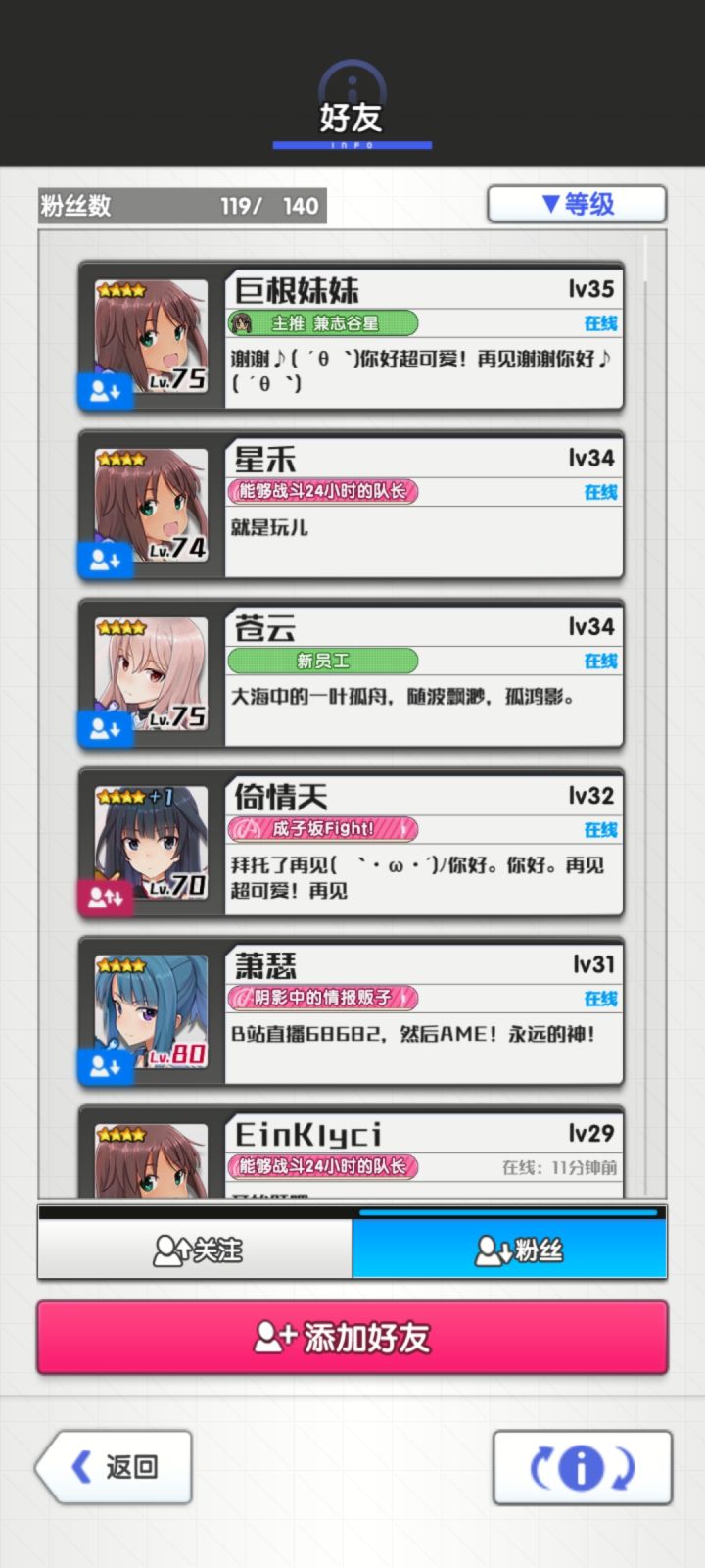 开服开始主力一直是桃歌,开了四星抽到接着玩 由于三星累积粉丝数比四星少 最开始还是爱花更高的虽然都会玩 但是还是喜欢双枪 因为桃歌ちゃん在用顺便一说 我首个十连选的爱花 最开始的一个月四星全是电属性的 所以练了一些另外属性的三星