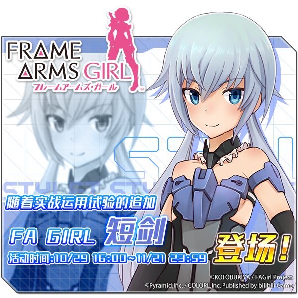 #机甲爱丽丝##Frame Arms Girl#队长们好!~《机甲爱丽丝》将于10月29日临时维护完成后,开启Frame Arms Girl联动的第2期主题活动——「短剑子也来了」。继轰雷之后,短剑也来到了成子坂制作所参与测试。不服输的她是否能在测试成绩上超过轰雷呢? 【活动时间】10月29日 16:00 ~ 11月21日 23:59 本次活动分为单人任务和协力任务。【单人任务部分】第1-5/6-8/9-11/12-14/15-16关,将从29日16:00起逐日开放,至11月2日的16:00开放所有关卡,单人任务的关卡结束时间均为11月21日 23:59。【多人协力部分】前篇开放时间:10月29日 16:00 ~ 10月31日 15:59;中篇开放时间:10月31日 16:00 ~ 11月2日 15:59;后篇开放时间:11月2日 16:00 ~ 11月8日 15:59;
