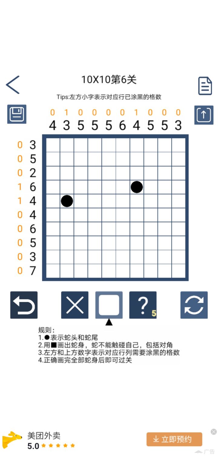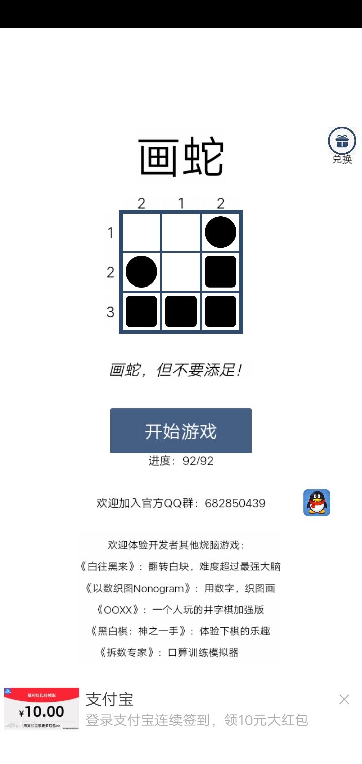 大家好,我个人开发的第六款益智烧脑游戏《画蛇》安卓版开启测试了!点击下面的链接即可下载。iOS的小伙伴们还需要稍微等一段时间。游戏的玩法非常简单,初始会标出蛇头和蛇尾,根据信息正确画出全部蛇身即可过关。这里给出部分截图:大家有兴趣也可以加入游戏官方群: 领取兑换码,并和高手一起交流技巧,也可以玩一下我的另外几款益智游戏:口算神器《拆数专家》:一个人玩的井字棋加强版《OOX