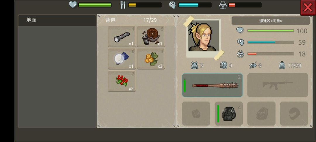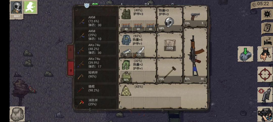 纪念岛四物品搜集情况。 游戏版本MiniDayZ+ v1.2 无使用任何bug。 原本最高到新手四岛就被黑匪给摸了。气的一个星期没碰这游戏。 开这个档后玩了两天,在岛三没刷汽油差点没熬过去,感谢保镖的眷顾,可惜在军营保镖贴脸吃喷了,在岛四一切稳定发展,且毕业装备已经备好。[表情_坏笑] 这个档装备是否可以直接冲刺岛五撤离了?还是要发展其他的物资? AKM(镜+持) 三组备弹 或L85(镜+持+榴)