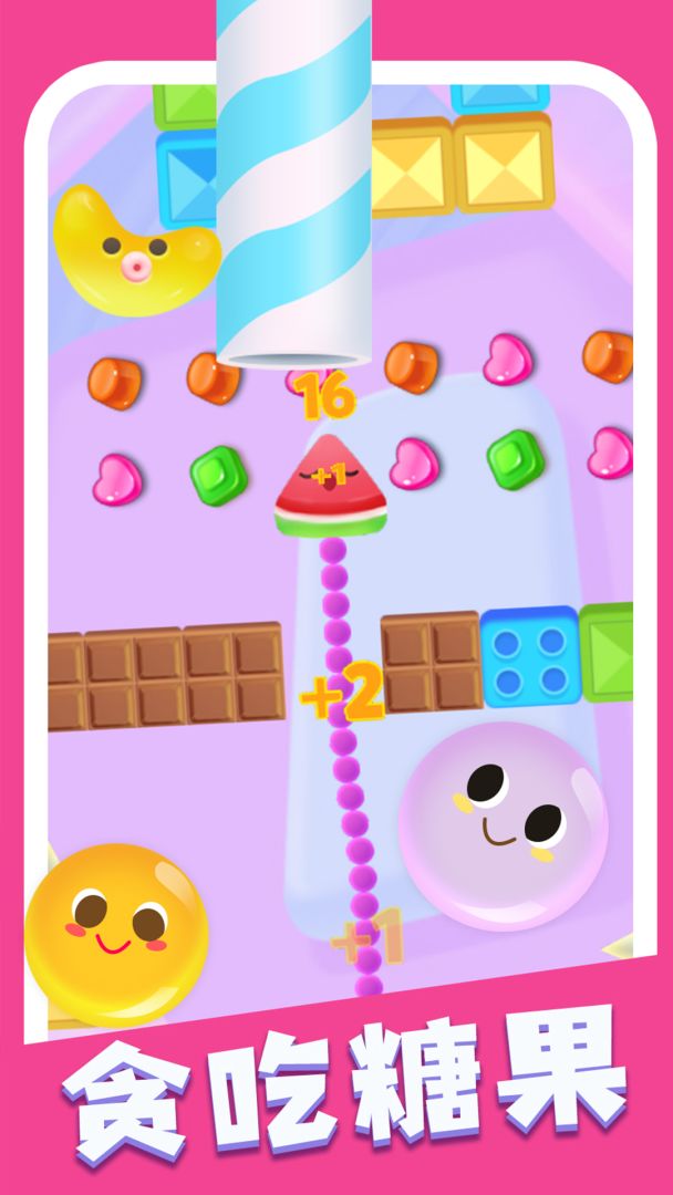 我是一颗活力四射 朝气蓬勃 五彩缤纷的… 跳跳糖!从你出生开始,你的目标就是奋力地向上爬行,一直到你的终点站“吸管”大门。在这个过程中,你会遇到各种困难:移动的底板,头戴小花超级臭美的虫子,可穿越的墙,带刺的门板,弹弹弹的棉花糖条等等。 1. 手指选中屏幕后糖果开始向上移动; 2. 糖果可以按照手指触摸的方向左右移动,吃掉途径的糖果; 3. 左右移动向上的糖果,避开邪恶的小虫子; 4. 最终达到制作糖果的入口处完成糖果的制作; 5. 多个游戏关卡,在完成关卡的过程中不断更换糖果的类别和罐子的样...