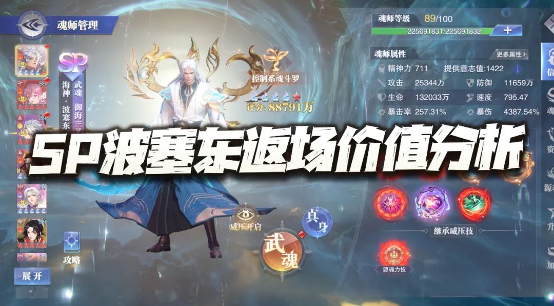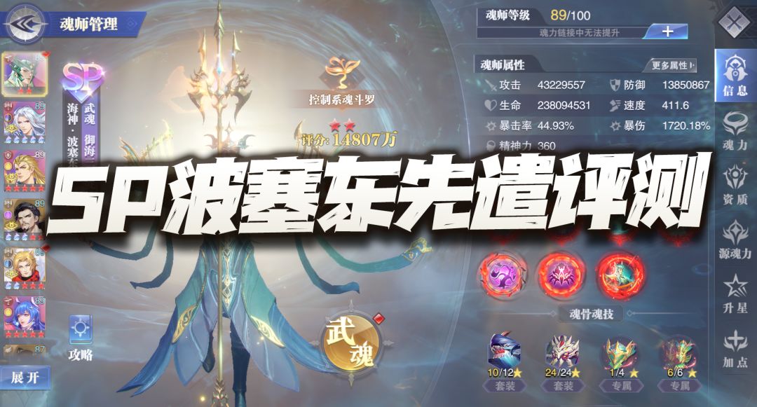 大家好,我是刚刚初测完SP波塞东的何二维一。 昨晚SP波塞东正式上线,这位魂师作为真正意义上的第一位神级魂师,想必在这个时间点上线也给了很多朋友不小的惊喜或惊吓......截止目前大部分朋友其实最想知道的便是SP波塞东到底强度如何,所以今早维一也是尽快的做了部分对比测试,相关结论在今天的攻略文章中会讲到,希望能给还在犹豫是否抽取的朋友一些小小的建议和参考。 首先SP波塞东的主要能力为长图增伤和PV