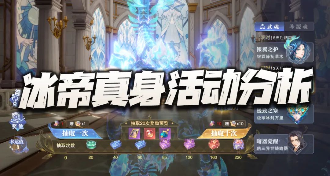 大家好,我是肚子有点胀气的何二维一。 今天早上游戏是突然上线了今年的情人节活动......其中更加突然的则是这个执子之手的双神魂骨抽取活动,240抽一个魂骨的保底成本......也是直接看呆了维一,基本上要保底就是8000钻石+几百元的成本,所以大家在抽这个魂骨之前也需要想清楚了自己的承受底线,另外对于普通平民玩家来讲,如果你脸特别白的话,用较低的成本抽到其中的1个魂骨倒也有希望,但想要以较低的成