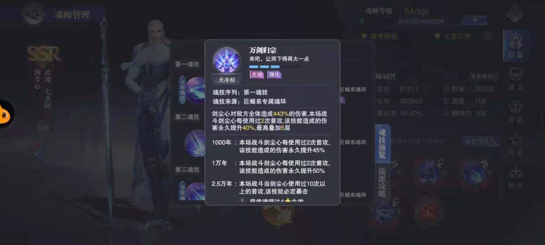 前言:这里阿混,一区破甲混子。之前讲过剑尘心基础解析,简单的过了一下关于尘心的一个定位和技能简单介绍,本章的话给老哥们大致解析一下尘心的所有技能以及不同情况下的技能配置。 专属技能介绍(所有技能都是以现版本最高的5W年魂环来说明): 巨蟹系1技能:一个需要靠普攻去叠加伤害的技能,5万年效果每2次普攻提高该技能55的伤害系数永久提升,最高叠加5次,敲一下计算机443乘1.55五次方,将近是一个380