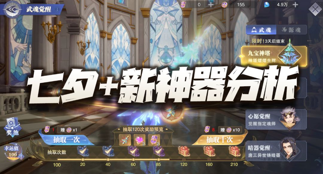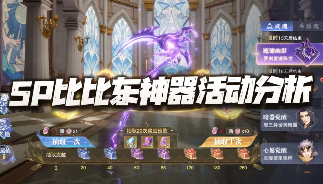 大家好,我是正在吃汉堡的何二维一。 今天游戏更新了3个活动,那么有关缔约卡池的问题昨天的攻略维一就已经讲到了,大家自行参考即可,反正这波UP池过后便是全新的5月新魂师来袭了,朋友们注意节约点资源才是。 那接着咱们来简单说说全新神器罗刹魔镰活动和杀戮对决活动的相关分析。 首先这个新神器活动的模板和过去的神器上线活动一致,都是10连抽8折的抽取方式,同时大奖除了这个新神器和各个器源之外,也加入了一位核