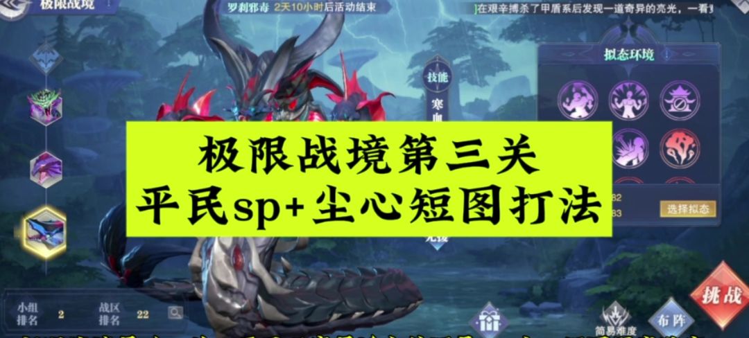 大家好,我是刚刚做完视频的何二维一。 今天恰逢是周五,悬赏终于开了,所以维一也就赶快去进行了SP尘心长图悬赏的阵容和打法测试,大致也有些许心得和结论分享给大家,所以今天咱们的攻略就来细聊一下其中的部分内容。 PS:这里先说个前提,因为今天是SP尘心上线后的第一次悬赏开启,由于时间并不是非常的充分,所以维一的多个测试结果不敢完全保证是最终答案,大家只是参考参考即可。 上图为今天维一主要测试的SP尘心