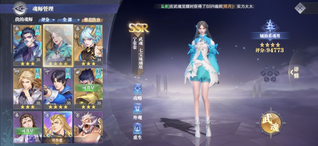 SP宁荣荣是一位非常值得获取的魂师,不仅拥有非常强大的长图增伤能力,并且还拥有强力的回复血量的能力,这一点在PVP上非常好用,还有着游戏中唯一的特殊胜利机制【九彩领域】开启后撑过十回合就能获得胜利。(而且和当下的新晋SP魂师唐昊可是绝配呢)还有一个小特色就是普攻就可以给全队拉条或者回复血量,并且还能使每个队友属性最高的一项再一次得到加强。 魂环加点推荐:PVP:2222、加点速度; PVE:111
