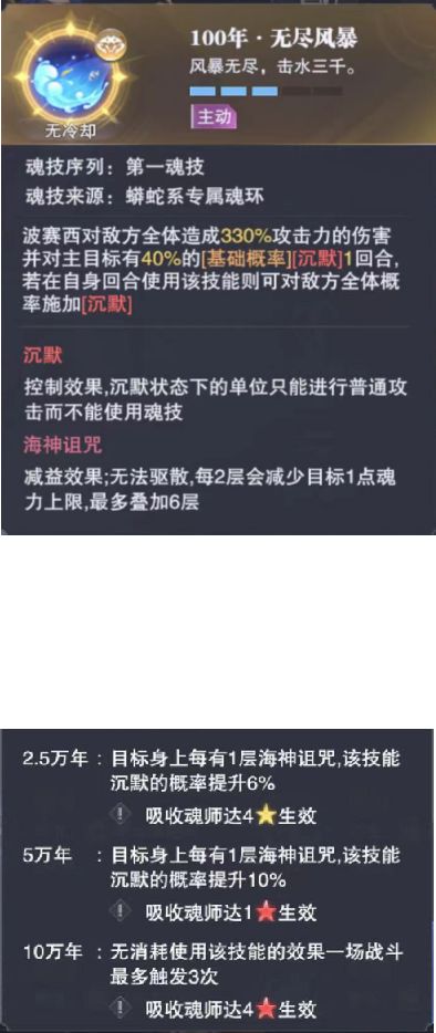 唐晨230抽实在没抽到 知道下个sp是波塞西女神后我决定一定要抽到 这次终于欧了一点点,3月1号0点80票抽出波塞西 立刻看下技能给大伙说说我的个人见解。 编辑于3月2日14:52----截图是3月1号上午,傍晚4-1技能描述进行了修改,最后的见解可能有误差请谅解。 先看技能→ 1技能蟒蛇简述:6层海神诅咒 100%【基础概率】全体沉默,需红1 1技能魔蛛简述:刷新海神祝福时间,邀战4层海