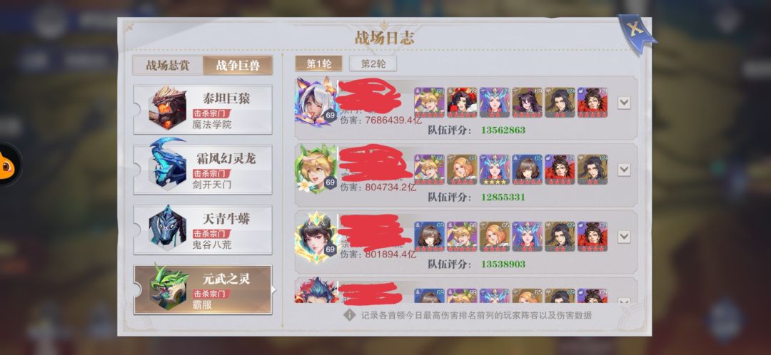 大家好,我是op婉婷今天给大家介绍这个新魂师悬赏伤害比拼,我一共有三套,如下所示: 第一代阵容(没有雪帝的) 阵容如下: sp小白1121—加点速度 Sp阿银 2222——加点精神——吃控制鱼 Sp霍雨浩2222——加点攻击——吃领域鱼 Sp千道流1111——加点生命——吃回血鱼 Sp香香1111——加点暴击——吃回魂鱼 Sp唐舞桐2222——加点爆伤(可以切换其他主c) 伤害如图: 第二代阵容(