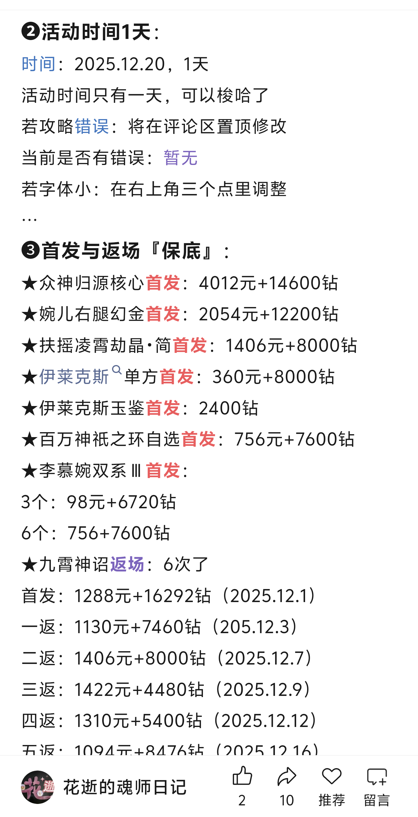一、活动时间:2025年12月20日05:00——2025年12月21日04:59。二、开启条件:玩家等级≥30级,2025年12月14日 04:59前开启的区服;三、玩法说明:银霜凝华活动开启,全新幸运值机制推出:银霜凝华活动分为两个奖池,左侧的星运奖池和右侧的扭蛋奖池,玩家可以使用银霜凝华券抽取星运奖池,使用银霜扭蛋币抽取扭蛋奖池。随着左侧星运奖池的抽取,还会解锁达标奖励;左侧主奖池共