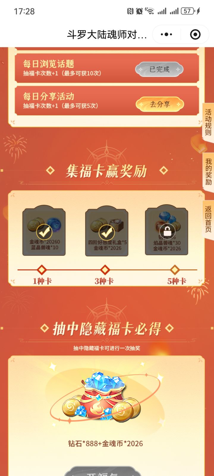 如图你集齐5张卡片奖励高达66个大钻石,你知道什么概念嘛就是每周的礼包码就是66个大钻石