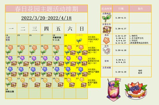 亲爱的各位店长大大~春天来啦,我们也将开启春日花园主题活动!【更新时间】3月18日9点,预计时间2小时,请各位店长大大合理安排游戏时间。【活动排期】【主要更新内容】春日花园主题活动(3月20日 - 4月18日)1.新增春日花园主题收藏,宾果活动,点数商店活动。2.新增春季专属任务,春季专用菜单。3.新增春季限时热卖活动。4.商店限时上架春日花园主题厨房,内装,外装道具。5.特殊