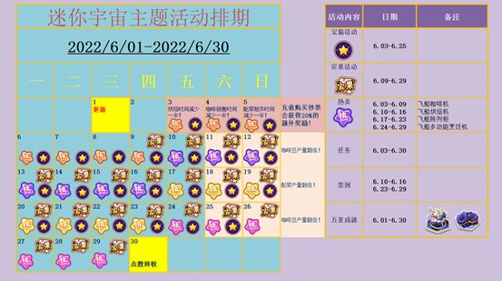 亲爱的各位店长大大~好消息~好消息~ 最新线报,mini宇宙主题活动要来啦!【更新时间】6月1日9点进行停服更新,预计时间2小时【更新内容】迷你宇宙主题活动(6月1日 - 6月30日)1.新增迷你宇宙主题收藏,宾果活动,宝箱活动。2.新增迷你宇宙专属任务,迷你宇宙专用菜单。3.新增迷你宇宙限时热卖活动。4.商店限时上架迷你宇宙主题厨房,内装,外装道具。5.新增端午节日限时buf