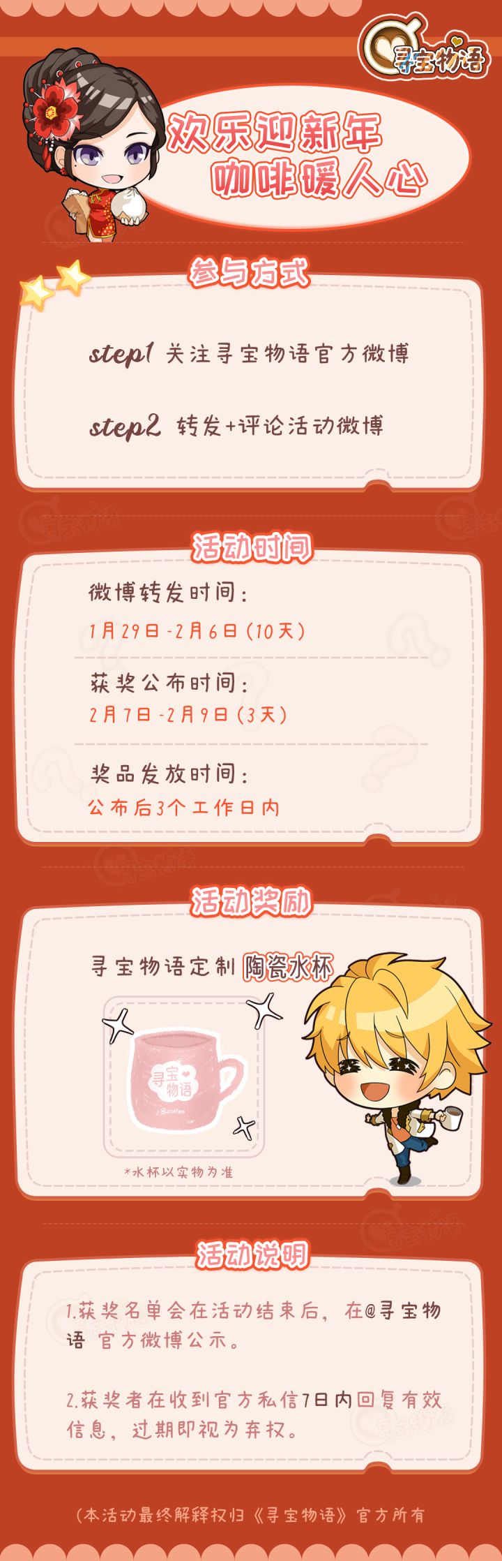 【微博绑定活动】玩家可在游戏内绑定微博账号&关注寻宝物语官方微博,领取5钞票奖励。【微博转发抽奖活动】活动时间1月29日-2月6日参与方式1.关注寻宝物语官方微博2.转发+评论1月29日当天的抽奖活动微博活动奖品寻宝物语官方定制水杯活动说明获奖名单将于2月7日-2月9日内公布。获奖者请在收到官方私信的7个工作日内,回复有效领奖信息,过期视为弃权。奖品将在名单公布的3个工作