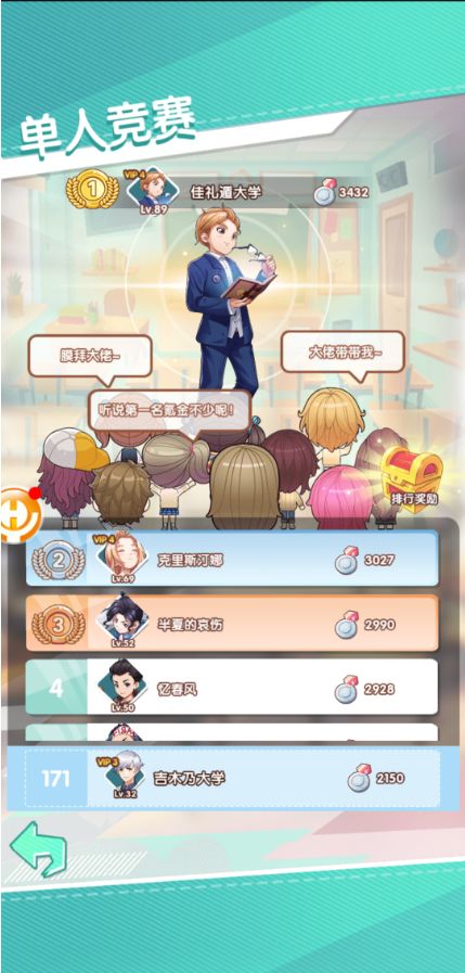 作为一个轻氪玩家,PVP一直是我的梦中乐园,这款游戏PVP共有2个模块,单人竞赛和五人竞赛。 令人称奇的就是这款游戏选取对手的方式,他是通过我当前的排名,然后选取上下25名玩家作为对手,并且我能看到我是否可以成功挑战这名对手,如果不能,我可以通过刷新直至选择到1名我可以战胜的对手。 先来说说单人竞赛,目前我已经达到200名以内了。 单人竞赛主要是考验玩家的学生数量和对学生自身的培养是否达标,同一个