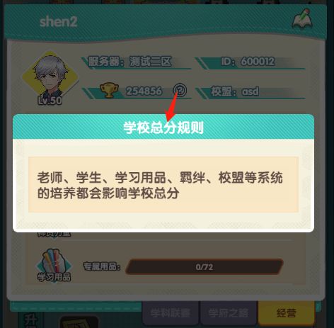小编在测试《学霸模拟器》的过程中,发现有些系统有着一些可能被忽略掉的细节,而运用好这些细节,可以大大提升玩家自身实力,所以小编将它们整理并展示给大家。 1. 学校总分的计算方式 首先对于学校总分,大家总是好奇学校总分的计算方式,其实在游戏中官方已经给出了学校总分的构成方式,没有发现的小伙伴请自觉面壁。 该规则界面隐藏在学校升级界面中的个人信息里,有兴趣的玩家可以自行查看哦。 2. 隐藏作弊器---