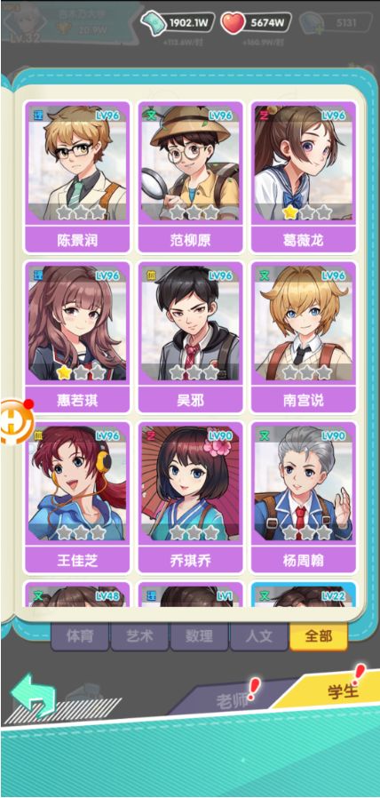 学生和老师系统是这个游戏中最重要的一环。先来介绍下学生系统,每名学生都有他擅长的学科,这个学科会影响他可穿戴的学习用品类型。 学生提升实力主要有升级、升品、阅读三种方式。学生升级会消耗心得,学生等级越高,消耗的心得越高;学生升级后会提升各项属性以及学费和心得产出的数量,毕竟有亏才有赚嘛。不要嫌升级低品质学生会浪费心得,在这款游戏里,低品质学生也是有春天的哦!因为这款游戏的升品区间很大,只要