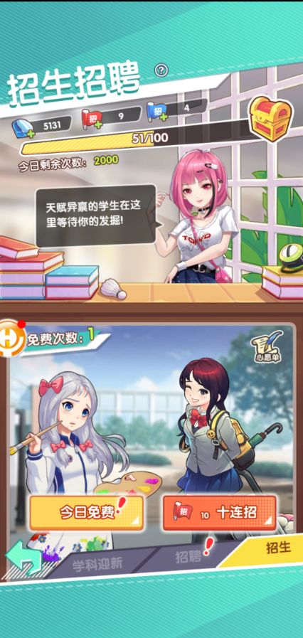 这个招生招聘(和抽卡一样)系统真的良心,保底概率很高,每20抽获得一张蓝卡(保底一张哦,有几率可以出现两章蓝卡),30抽获得一张紫卡(也是保底哦)。而且满100抽,可以获得一张特招函,特招函里面必包含4张紫卡以供挑选, 让我深深的感到非酋也是有春天的!!有一点要注意下,招生和招聘的卡池中都有一个叫心愿单的东西,你可以看看哪些学生的2阶立绘你比较向往,或者哪些老师你比较喜欢,都可以在这里填写心愿